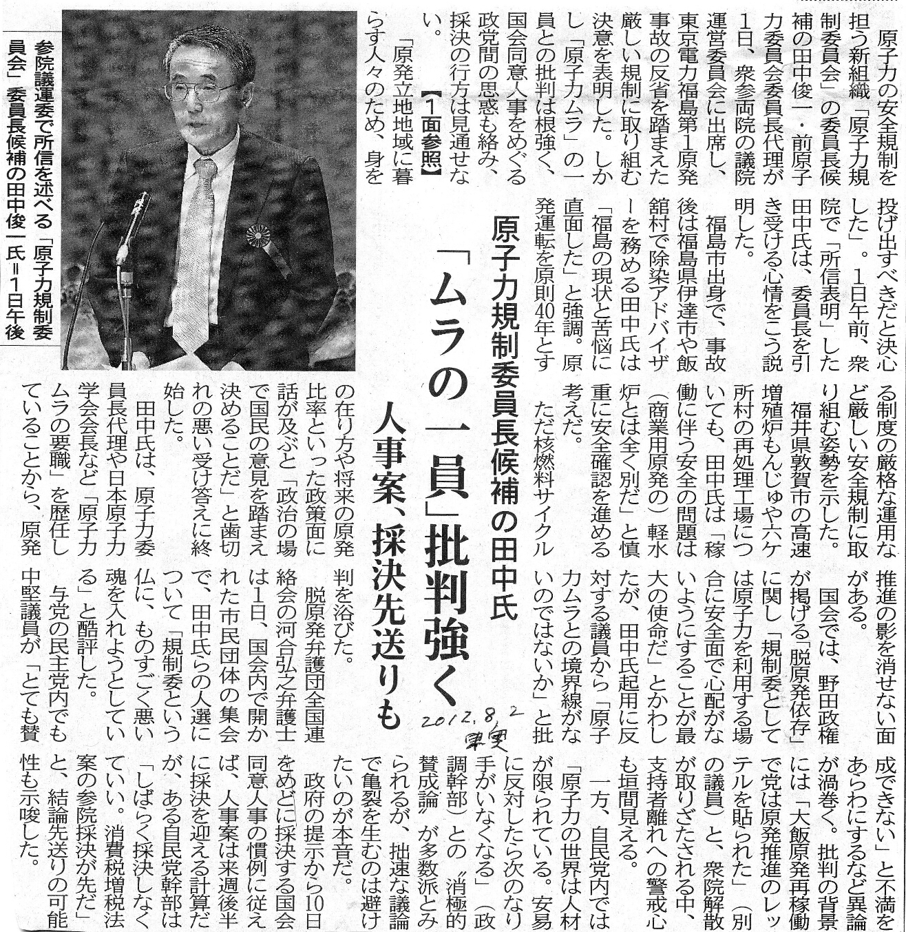 [2012_08_02_01]原子力規制委員会委員長候補の田中氏 「ムラの一員」批判強く 人事案、採決先送りも(東奥日報2012年8月2日)