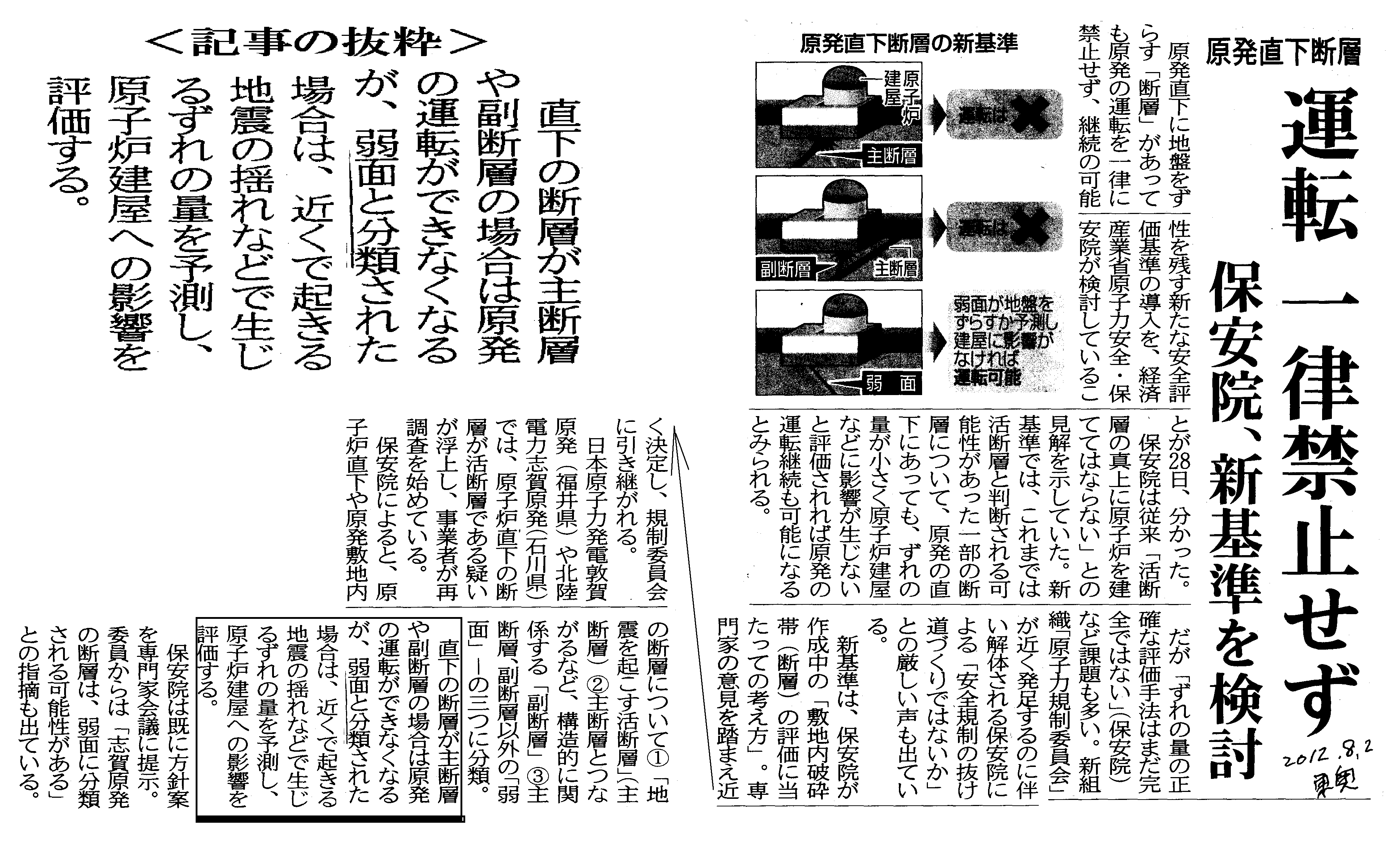 [2012_08_02_02]保安院 新基準を検討 原発直下断層 運転一律禁止せず (東奥日報2012年8月2日)