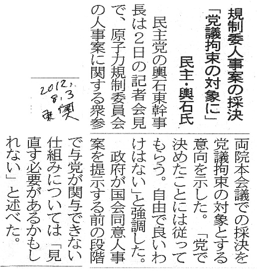 [2012_08_03_02]規制委人事案の採決 「党議拘束の対象に」 民主・輿石氏(東奥日報2012年8月3日)