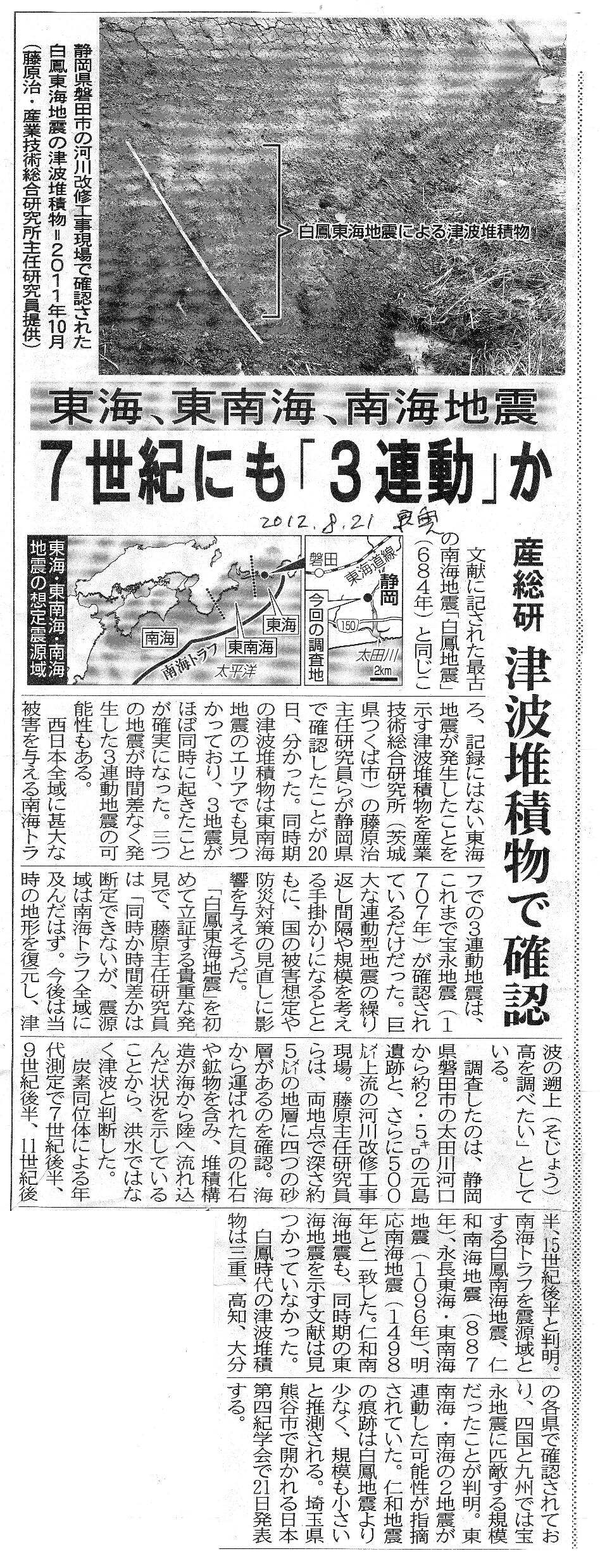 | [2012_08_21_01]東海、東南海、南海地震 7世紀にも「3連動」か 参総研 津波堆積物で確認(東奥日報2012年8月21日) |