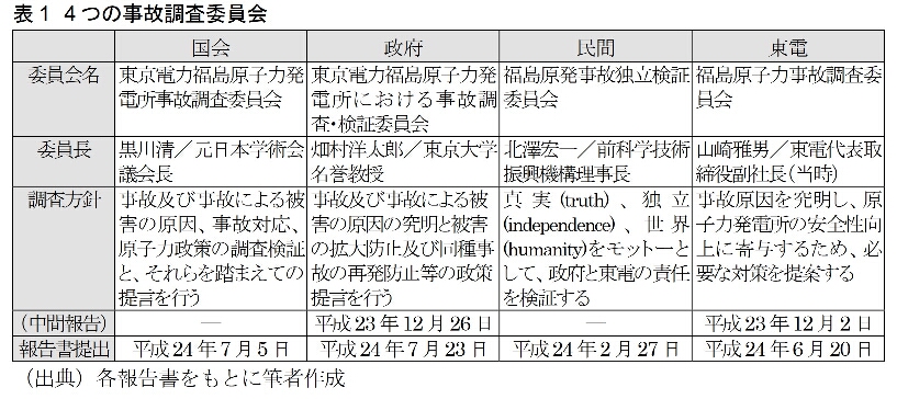1 4つの事故調査委員会 1 事故調査の意義 大きな事故に対しては、通常、その事業者や規制・監督にあたる政府が、事故原因を調査し、対策を検討する。事業者と政府は、事故に関する1次情報を保有し、当該分野についての専門性を持つ点から、調査にあたる責務がある。さらに、調査結果を報告書として公表することで、事故の教訓を広く共有し、その再発を防止することは、社会の健全な発展にとって不可欠な取組みである。 今回の原発事故は、その重大性の点からも、事故後対応において政府も当事者であった点からも、事業者である東京電力(以下、東電)や政府とは独立した主体による、客観的かつ多面的な事故分析と課題の整理が求められた。国会と民間による事故調査はこうした意味において重要性が高い。国会、政府、民間、東電の4つの事故調査委員会は、それぞれの調査方針により事故の調査と検証を進め、報告書を公表した(表1)。 |