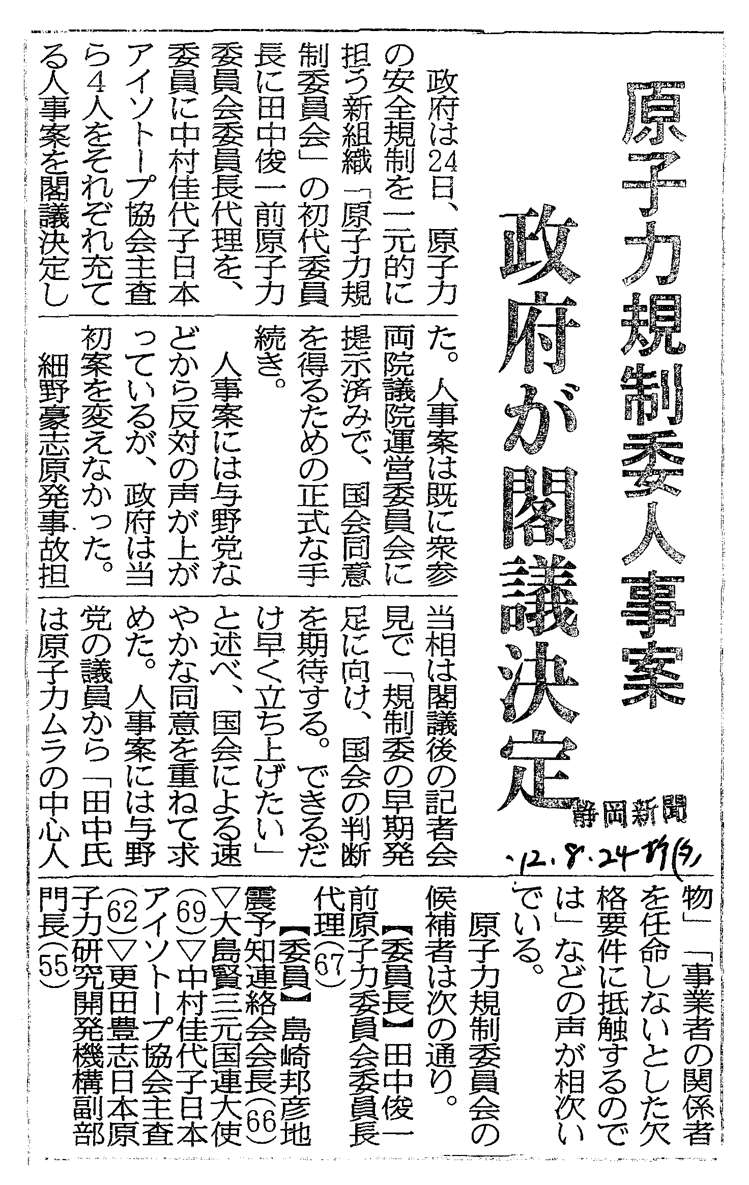 | [2012_08_24_01]原子力規制委人事案 政府が閣議決定 (静岡新聞2012年8月24日) |