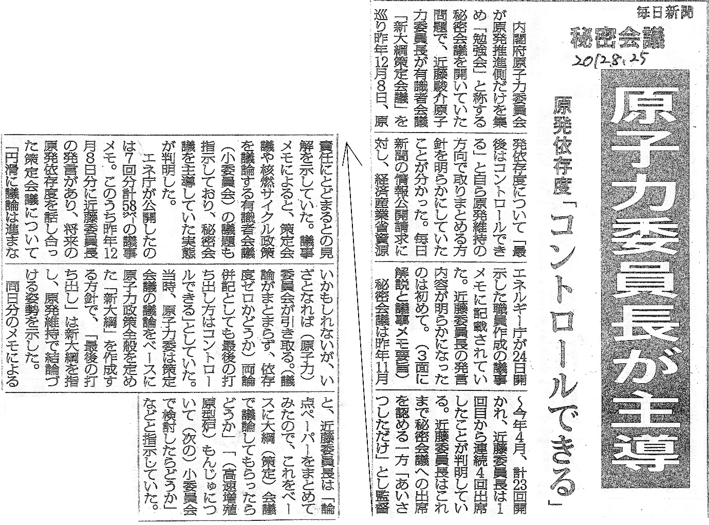 [2012_08_25_01]秘密会議 原子力委員長が主導 原発依存度 「コントロールできる」(毎日新聞2012年8月25日)