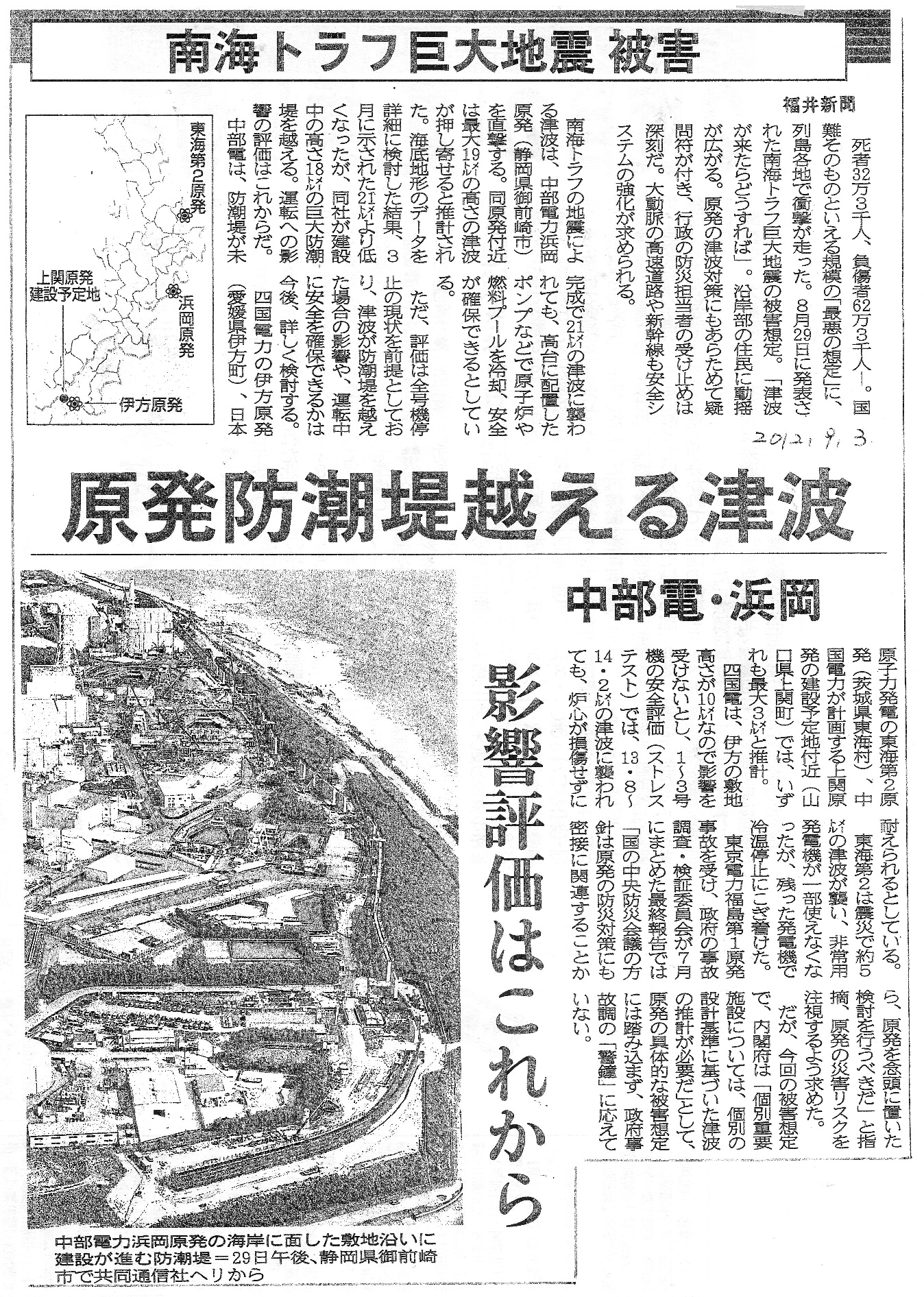 | [2012_09_03_01]南海トラフ巨大地震 被害 原発防潮堤越える津波 中部電浜岡 影響評価はこれから(福井新聞2012年9月3日) |