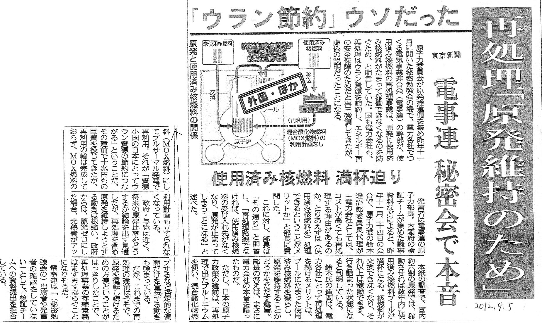 [2012_09_05_01]再処理「原発維持のため」 「ウラン節約」ウソだった 電事連 秘密会で本音 使用済み核燃料満杯迫り(東京新聞2012年9月5日)