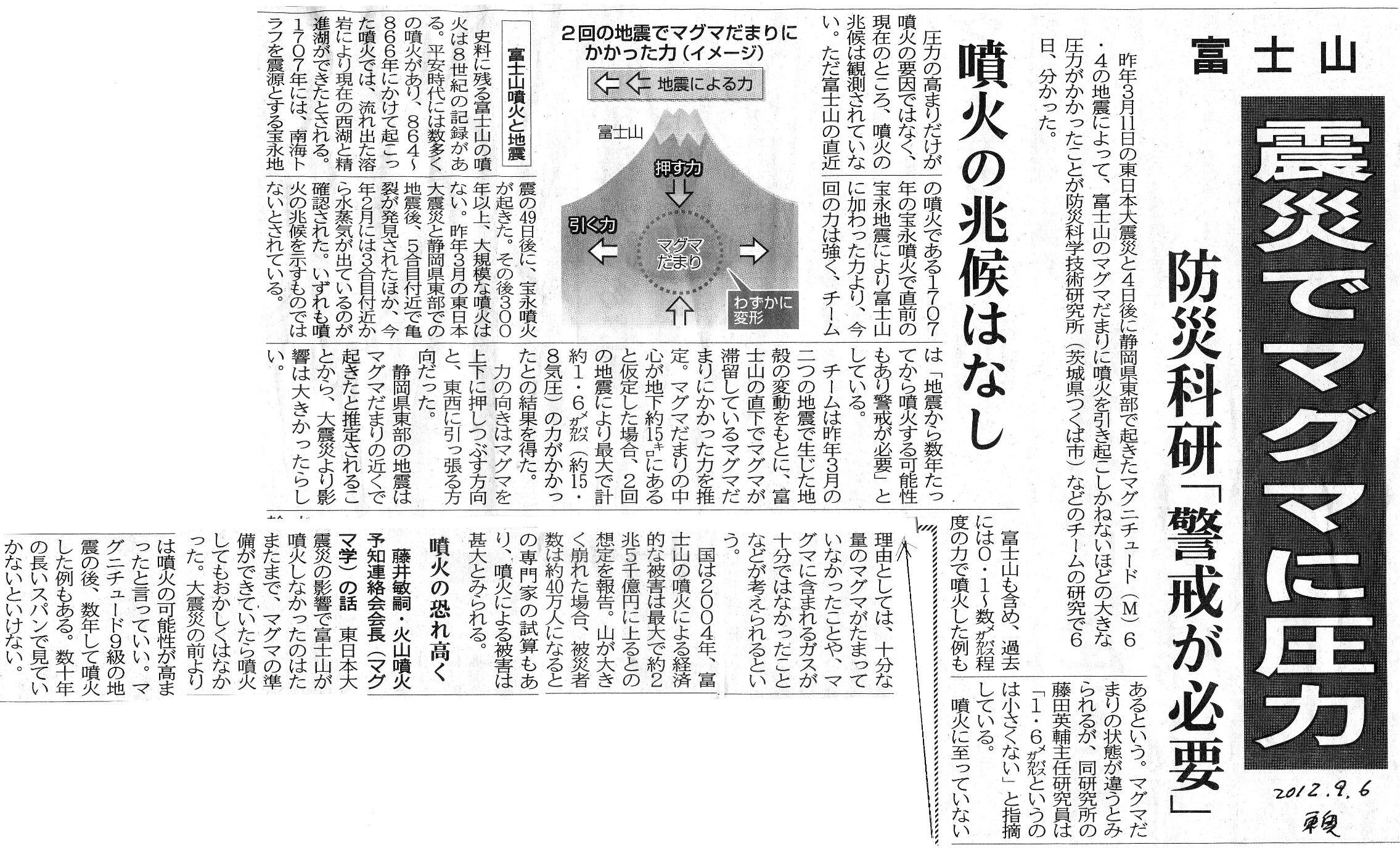 [2012_09_06_02]富士山 震災でマグマに圧力 防災科研「警戒が必要」 噴火の兆候はなし(東奥日報2012年9月6日)