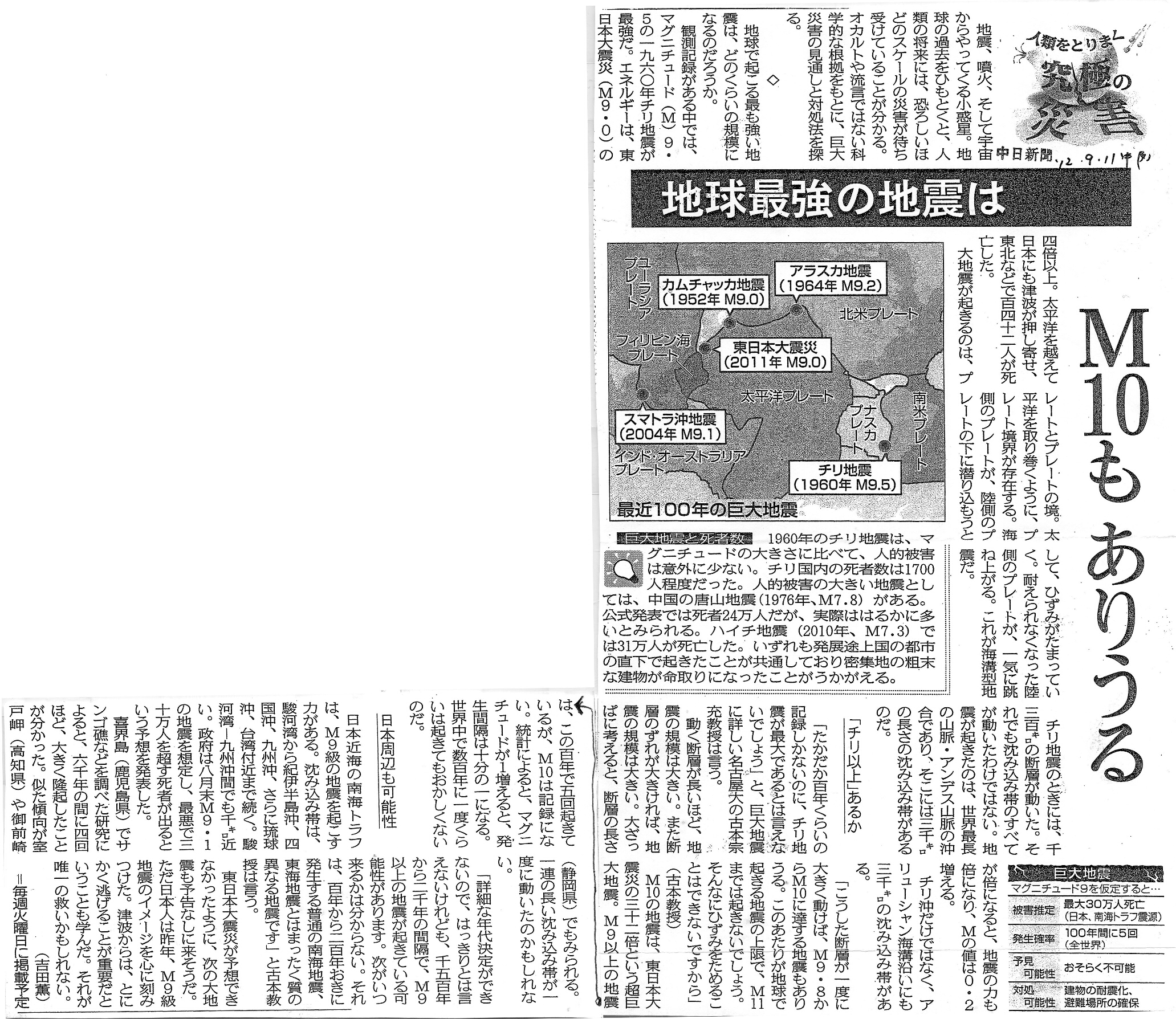 [2012_09_11_01]人類をとりまく 究極の災害 地球最強の地震は M10もありうる(中日新聞2012年9月11日)