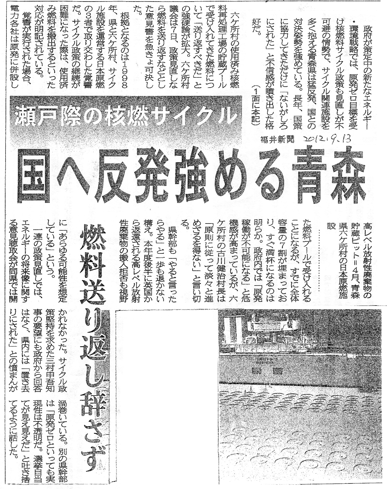 [2012_09_13_01]瀬戸際の核燃サイクル 国へ反発強める青森 燃料送り返し辞さず(福井新聞2012年9月13日)