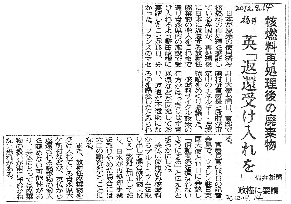 [2012_09_14_02]核燃料再処理後の廃棄物 英「返還受け入れを」 政権に要請(福井新聞2012年9月14日)