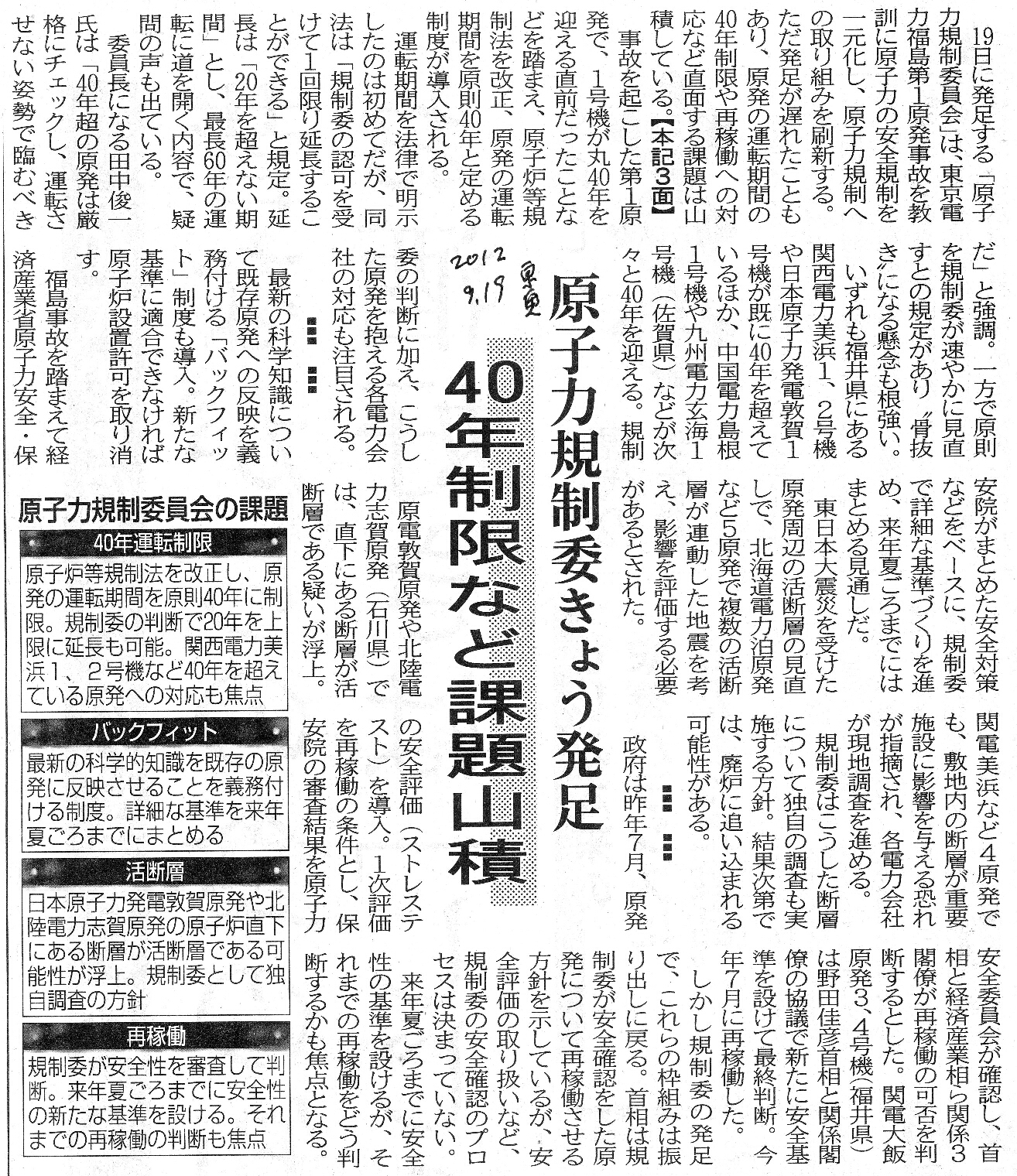 [2012_09_19_01]原子力規制委きょう発足 40年制限など課題山積(東奥日報2012年9月19日)