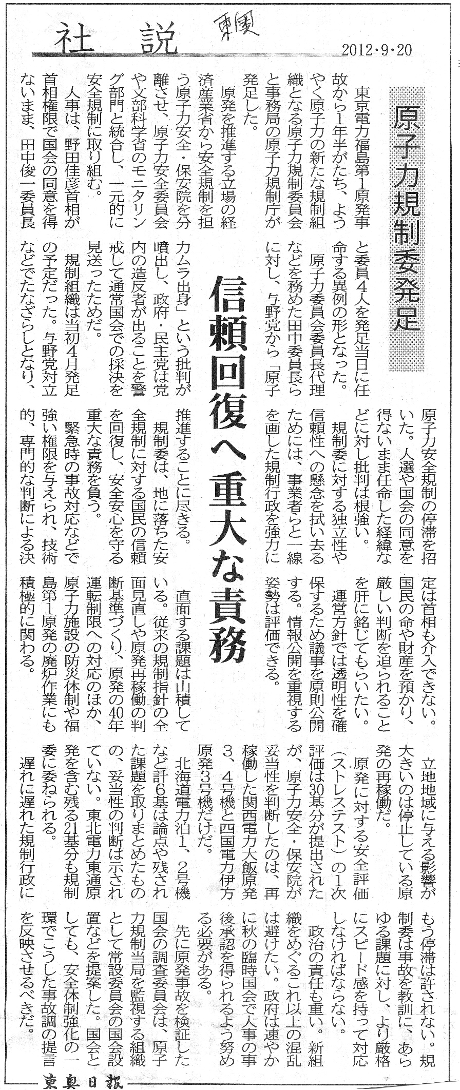 [2012_09_20_04]社説 原子力規制委発足 信頼回復へ重大な責務(東奥日報2012年9月20日)
