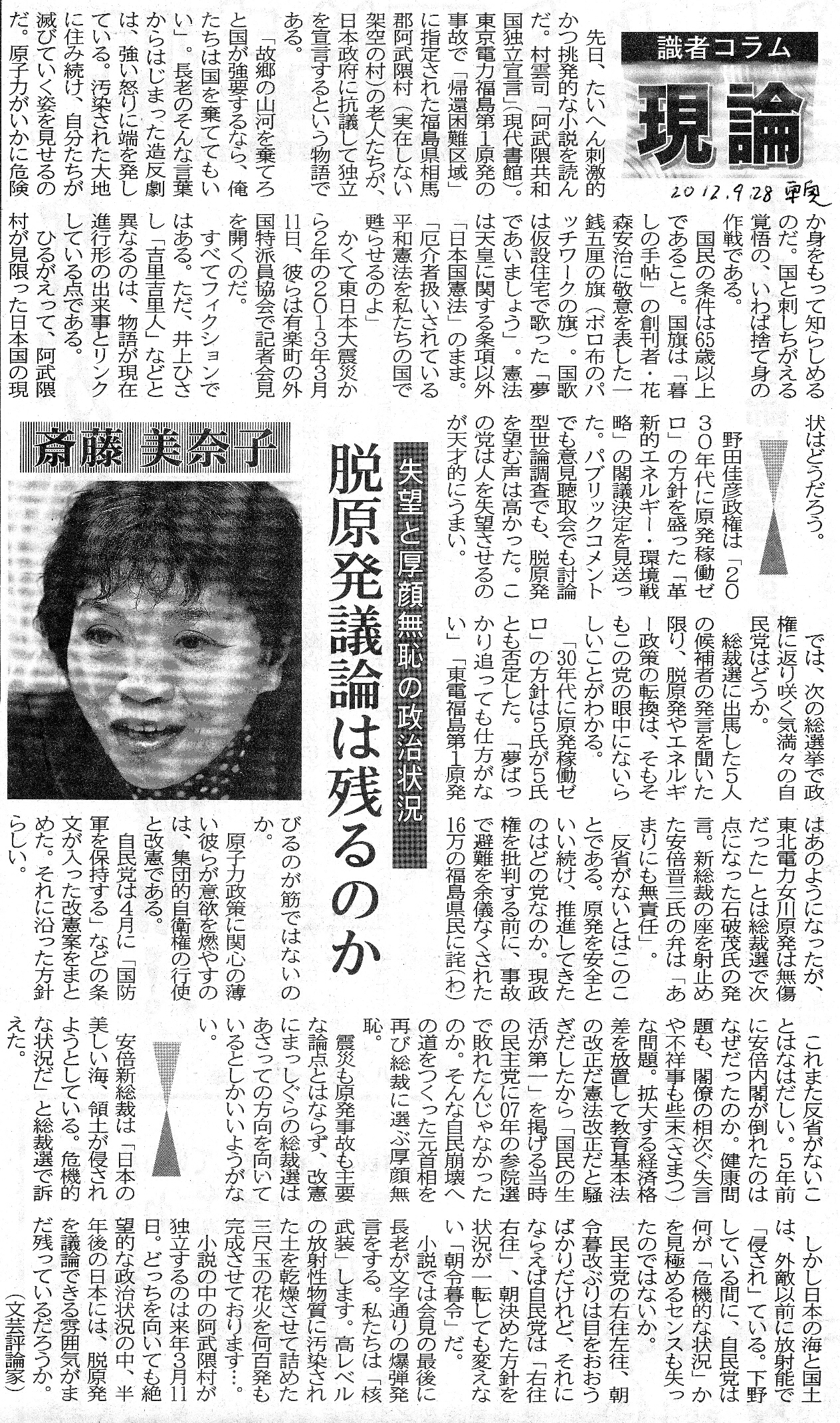 [2012_09_28_01]識者コラム 現論 斎藤美奈子 失望と厚顔無恥の政治状況 脱原発議論は残るのか(東奥日報2012年9月28日)