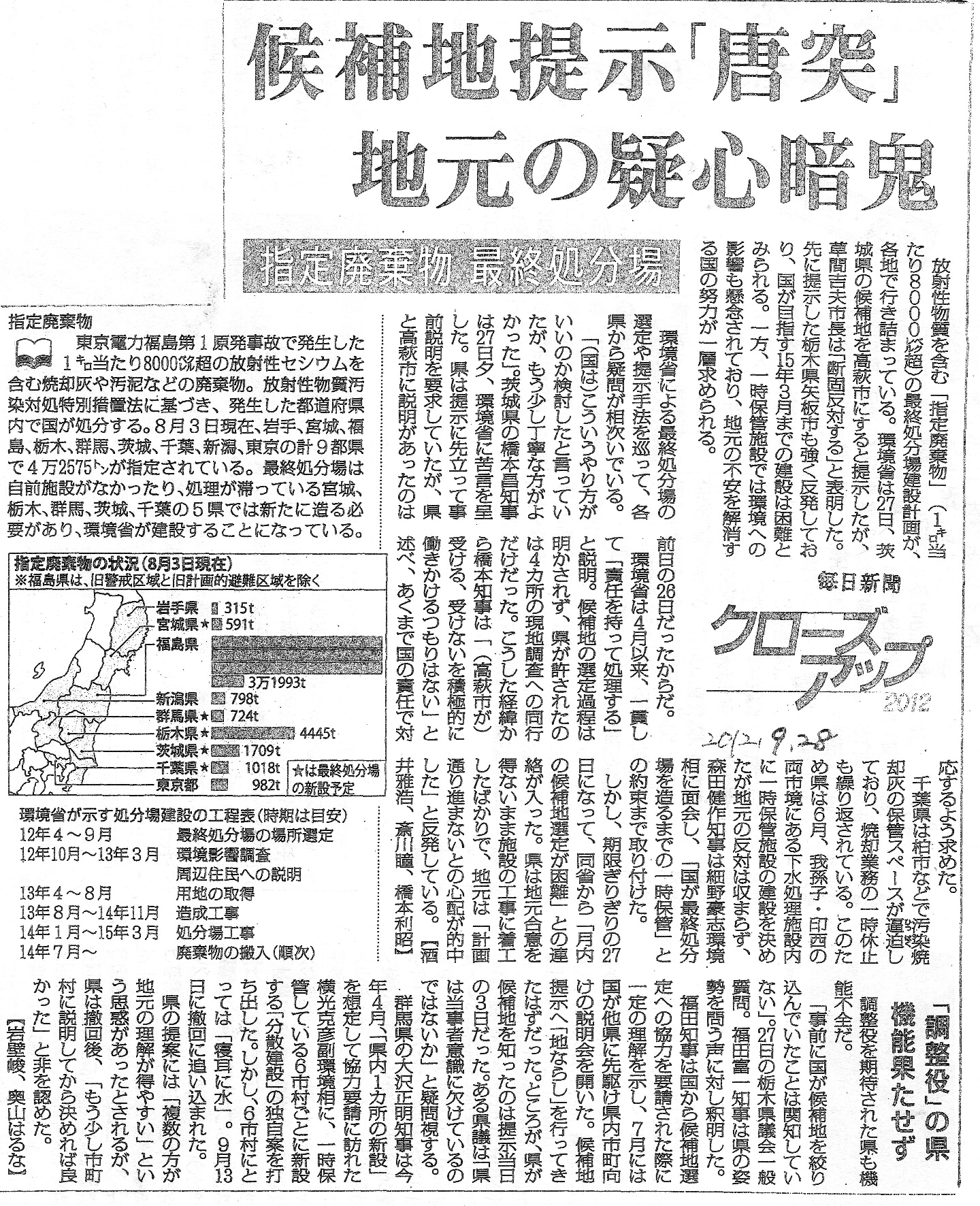 [2012_09_28_02]クローズアップ2012 指定廃棄物 最終処分場 候補地提示「唐突」 地元の疑心暗鬼(毎日新聞2012年9月28日)