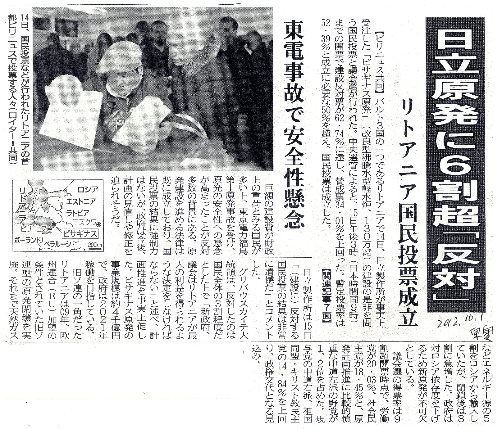 [2012_10_01_01]日立原発に6割超「反対」 リトアニア国民投票成立 東電事故で安全性懸念(東奥日報2012年10月1日)
