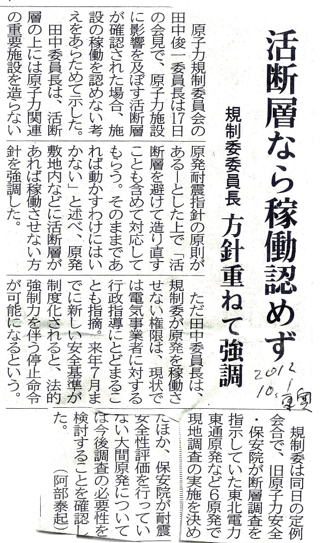 [2012_10_01_02]活断層なら稼働認めず 規制委委員長 方針重ねて強調(東奥日報2012年10月1日)