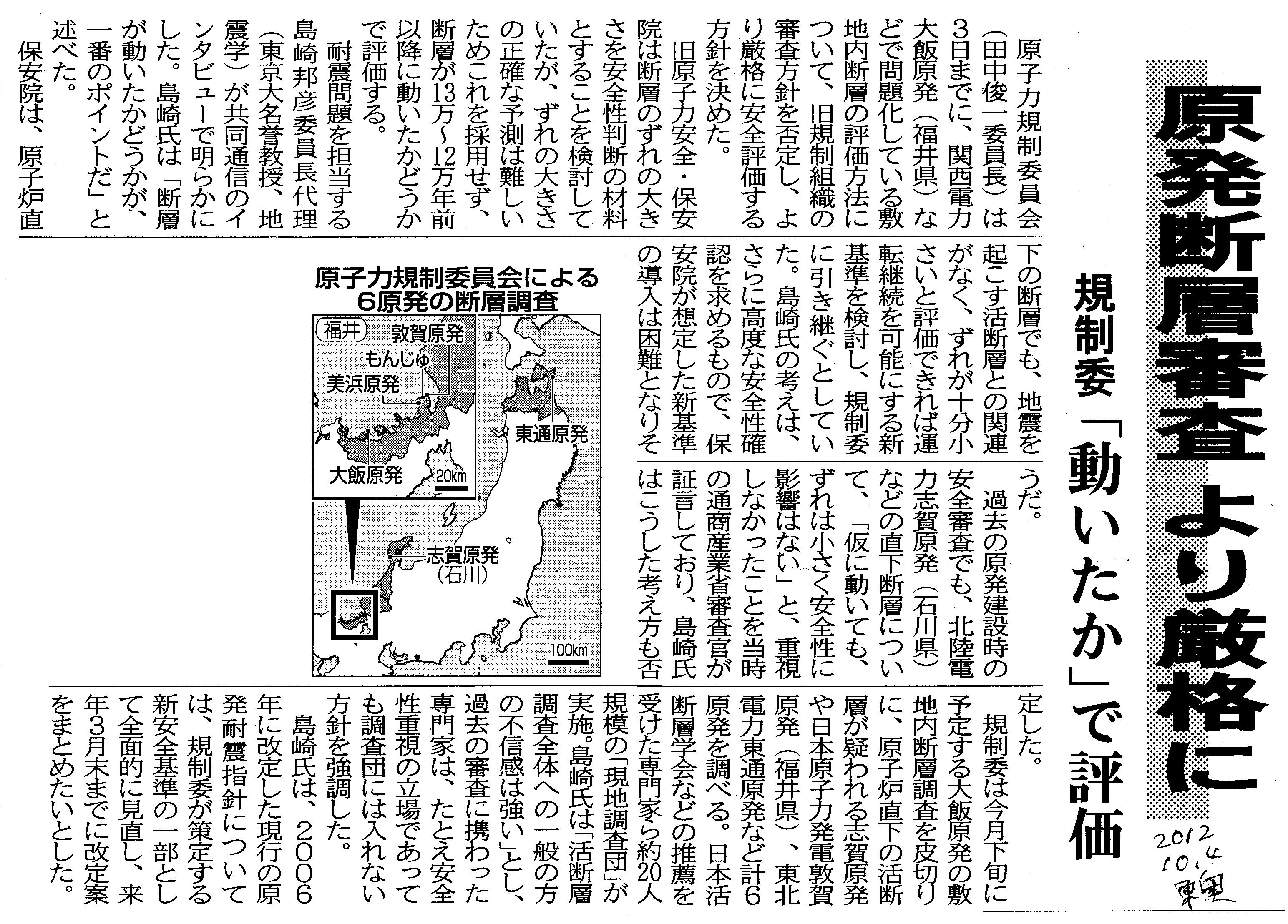 [2012_10_04_01]規制委 原発断層審査より厳格に 「動いたか」で評価(東奥日報2012年10月4日)
