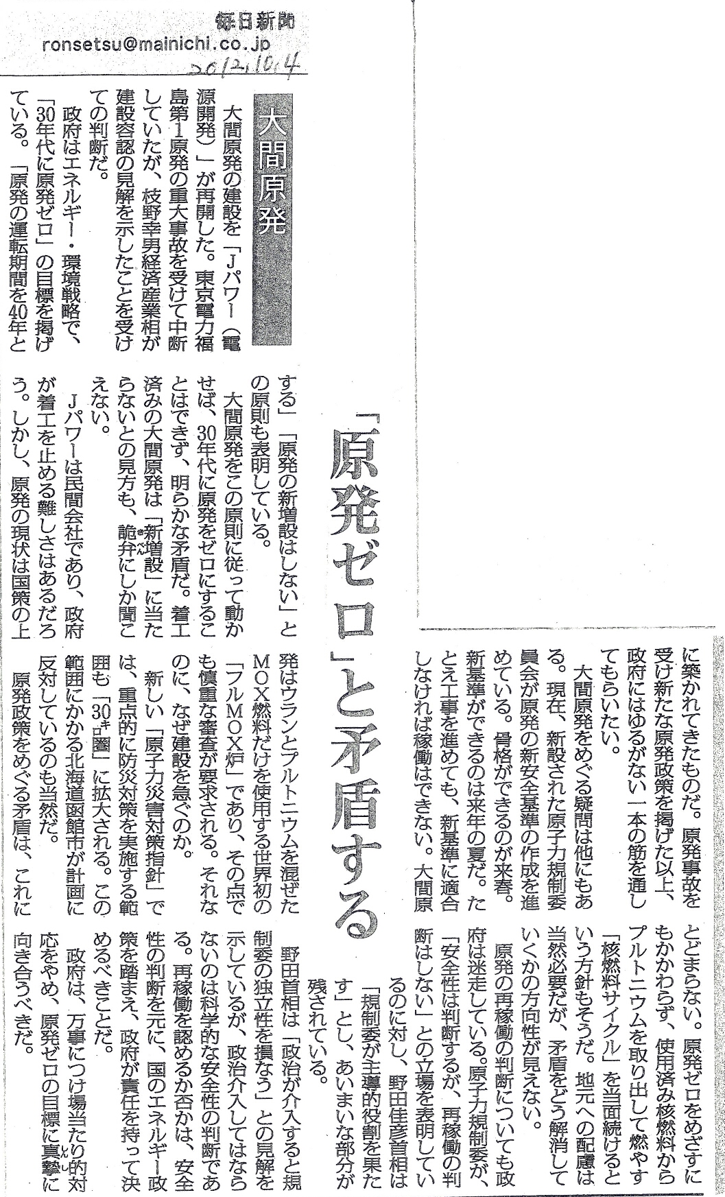 [2012_10_04_04]大間原発 「原発ゼロ」と矛盾する 社説(毎日新聞2012年10月4日)