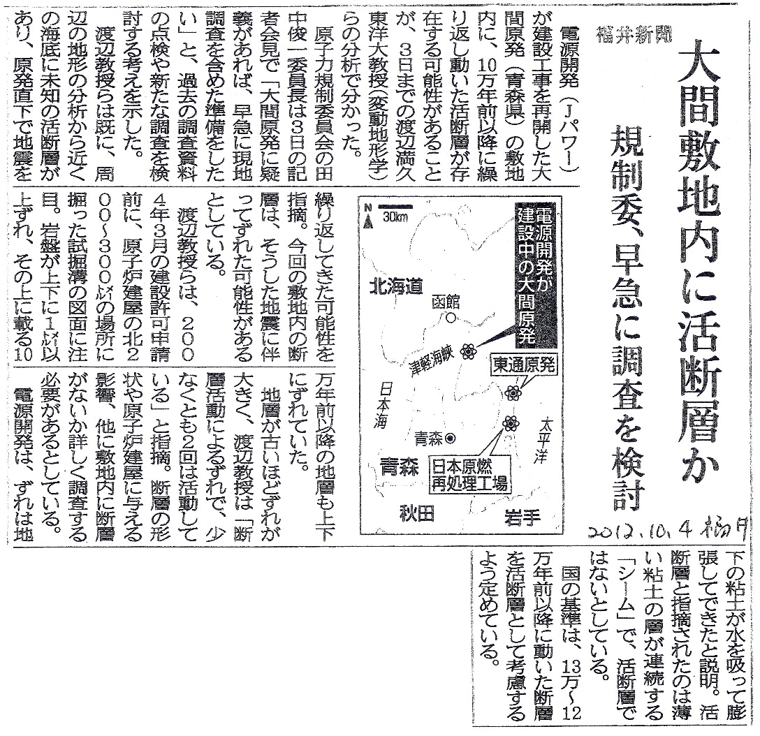 | [2012_10_04_05]大間敷地内に活断層か 規制委、早急に調査を検討(福井新聞2012年10月4日) |