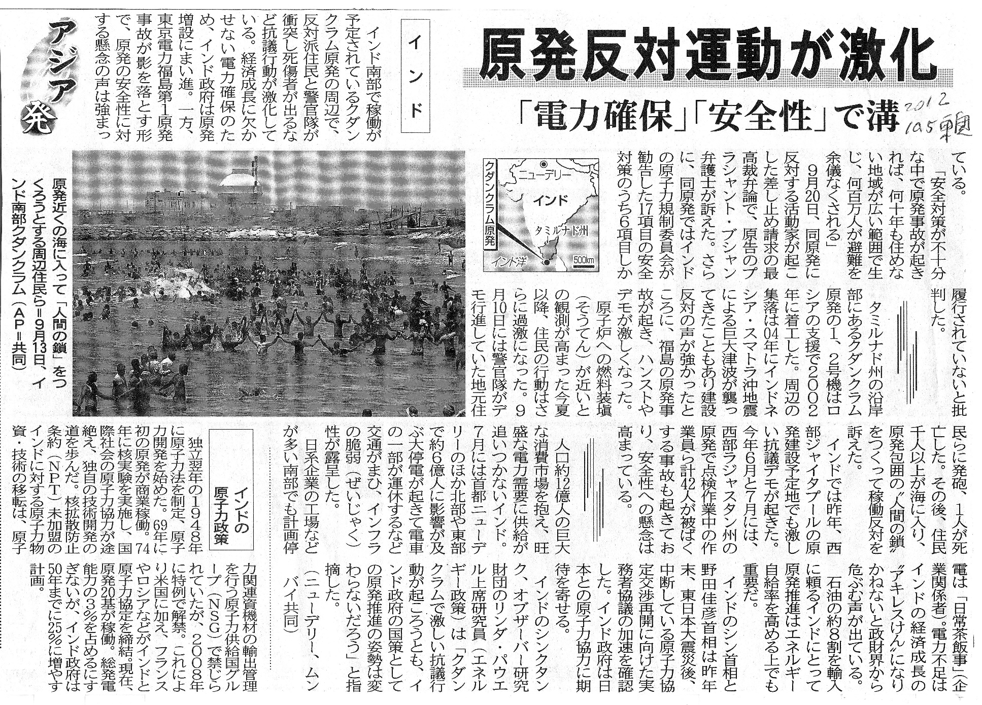 [2012_10_05_01]インド 原発反対運動が激化 「電力確保」「安全性」で溝(東奥日報2012年10月5日)