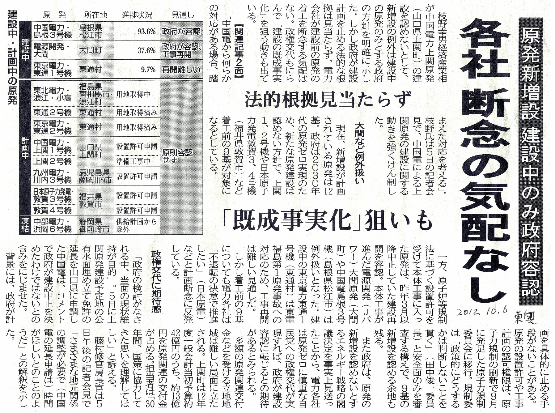 [2012_10_06_01]原発新増設 建設中のみ政府容認 各社断念の気配なし 法的根拠見当たらず 「既成事実化」狙いも 政権交代に期待感(東奥日報2012年10月6日)