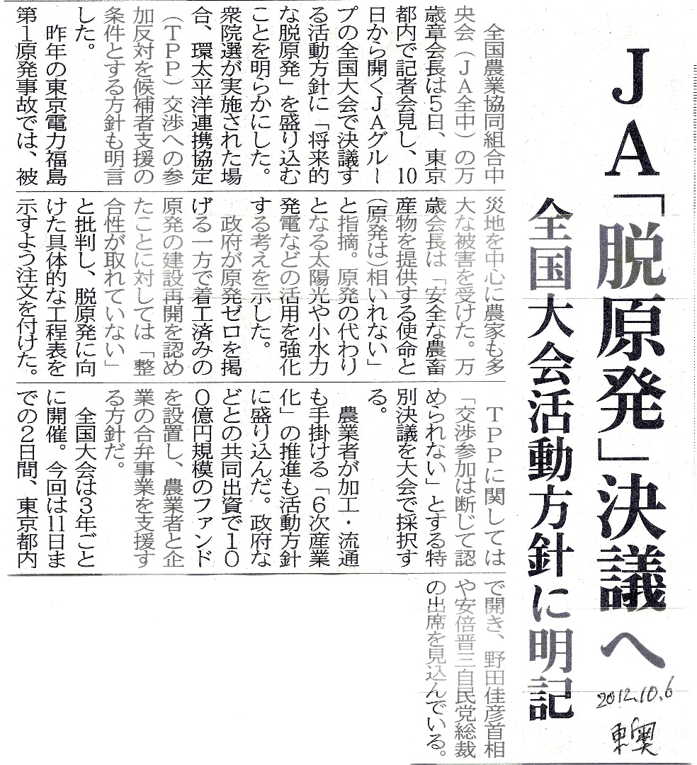 [2012_10_06_02]JA「脱原発」決議へ 全国大会活動方針に明記(東奥日報2012年10月6日)