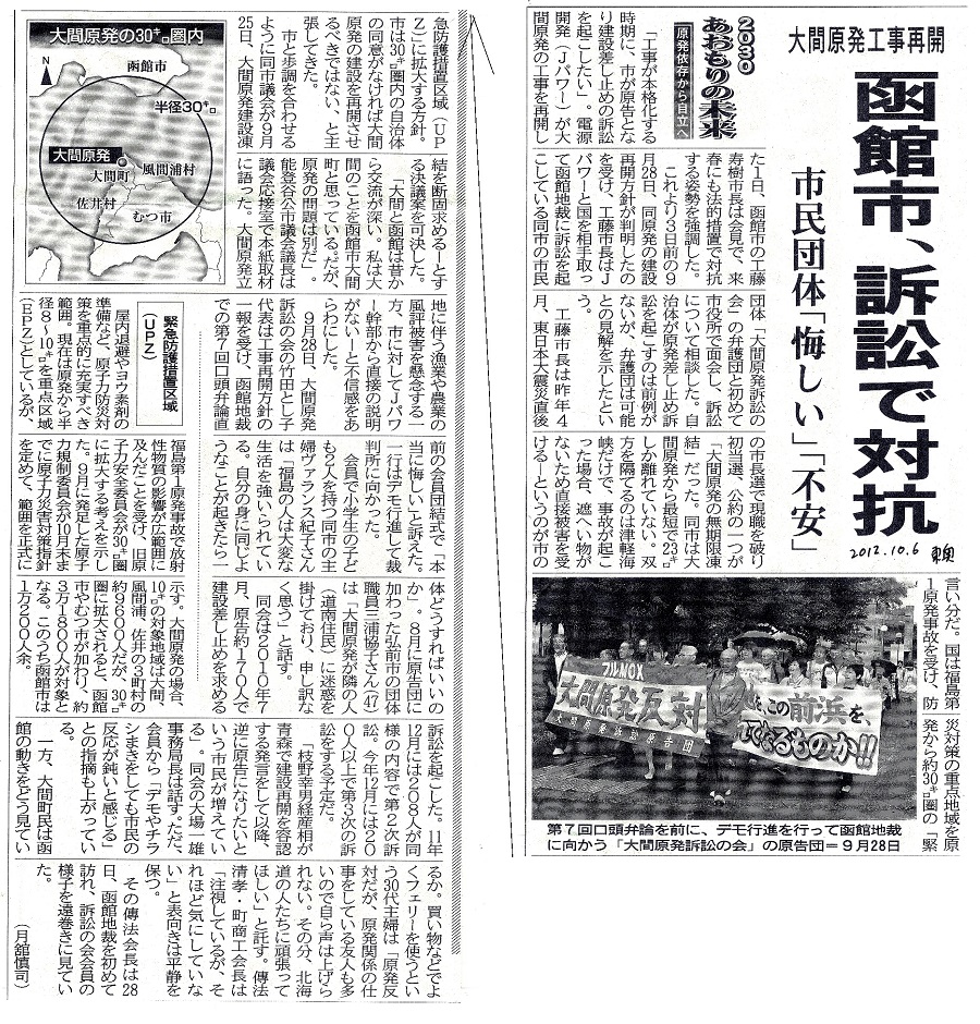 | [2012_10_06_05]2030 あおもりの未来 原発依存から自立へ 大間原発工事再開 函館市、訴訟で対抗 市民団体「悔しい」「不安」(東奥日報2012年10月6日) |