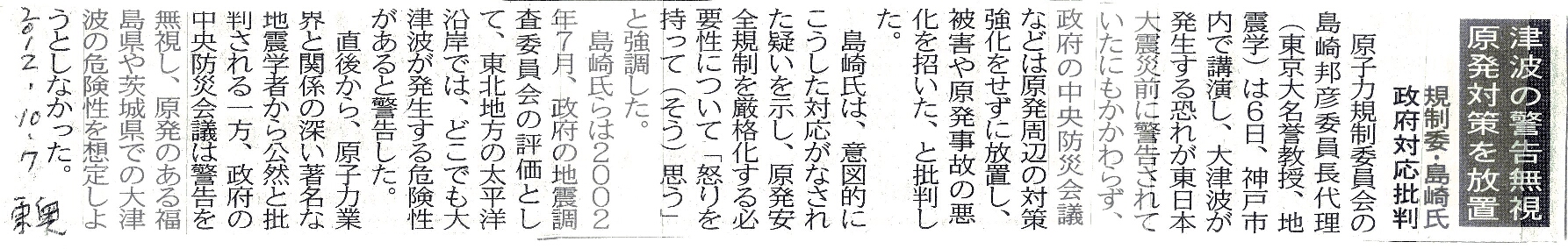 | [2012_10_07_01]津波の警告無視 原発対策を放置 規制委・島崎氏 政府対応批判(東奥日報2012年10月7日) |