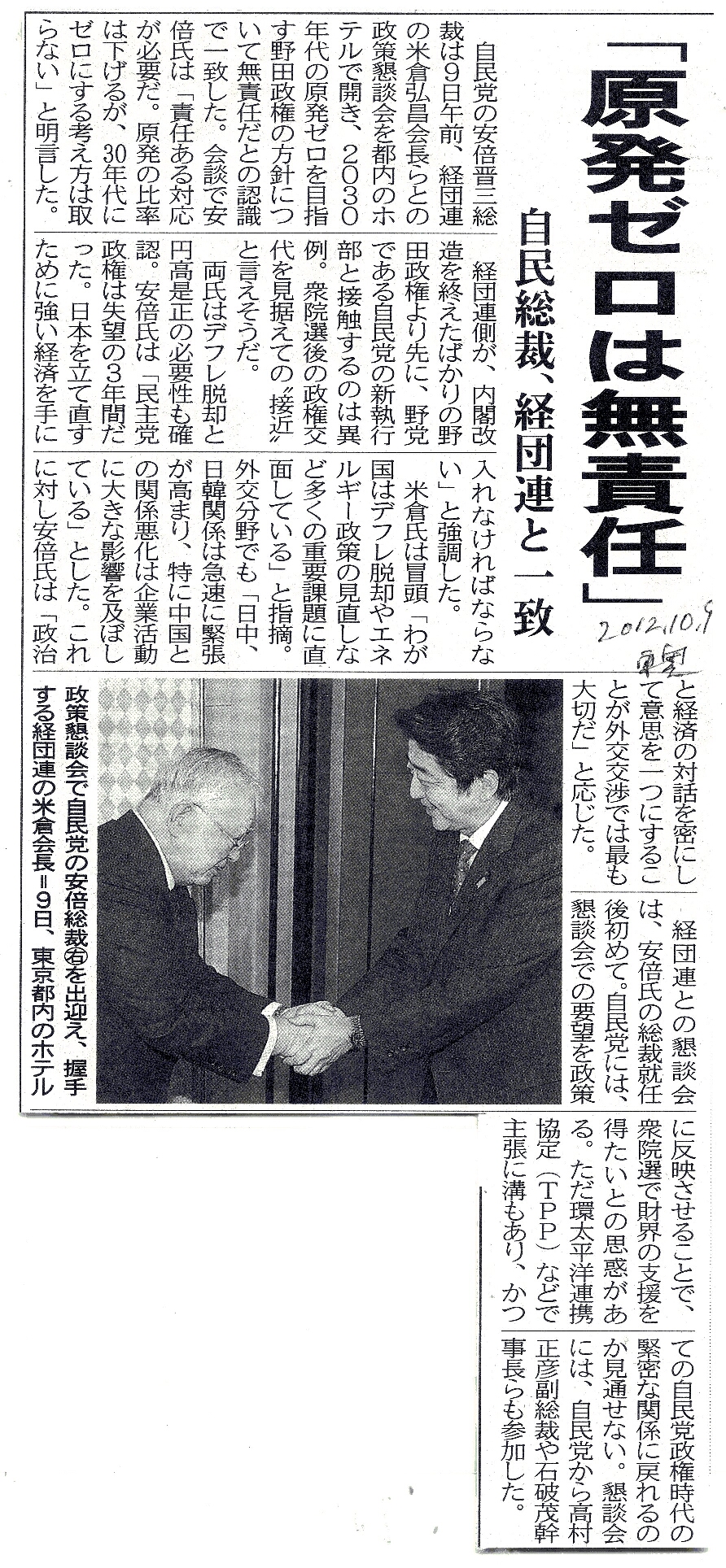 [2012_10_09_01]「原発ゼロは無責任」 自民総裁、経団連と一致(東奥日報2012年10月9日)