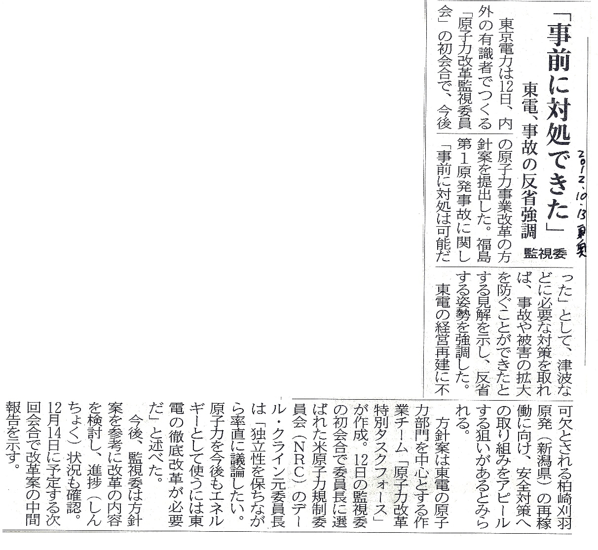 [2012_10_13_01]「事前に対処できた」 東電、事故の反省強調 監視委(東奥日報2012年10月13日)