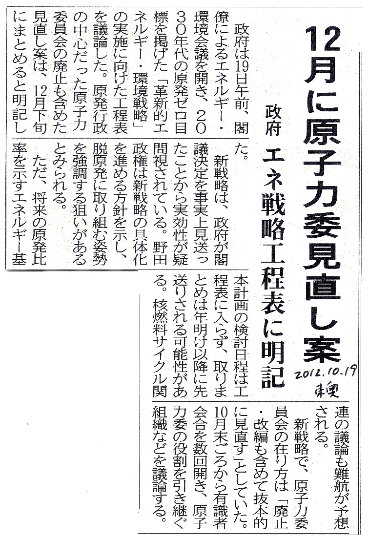 [2012_10_19_01]12月に原子力委見直し案 政府 エネ戦略工程表に明記(東奥日報2012年10月19日)