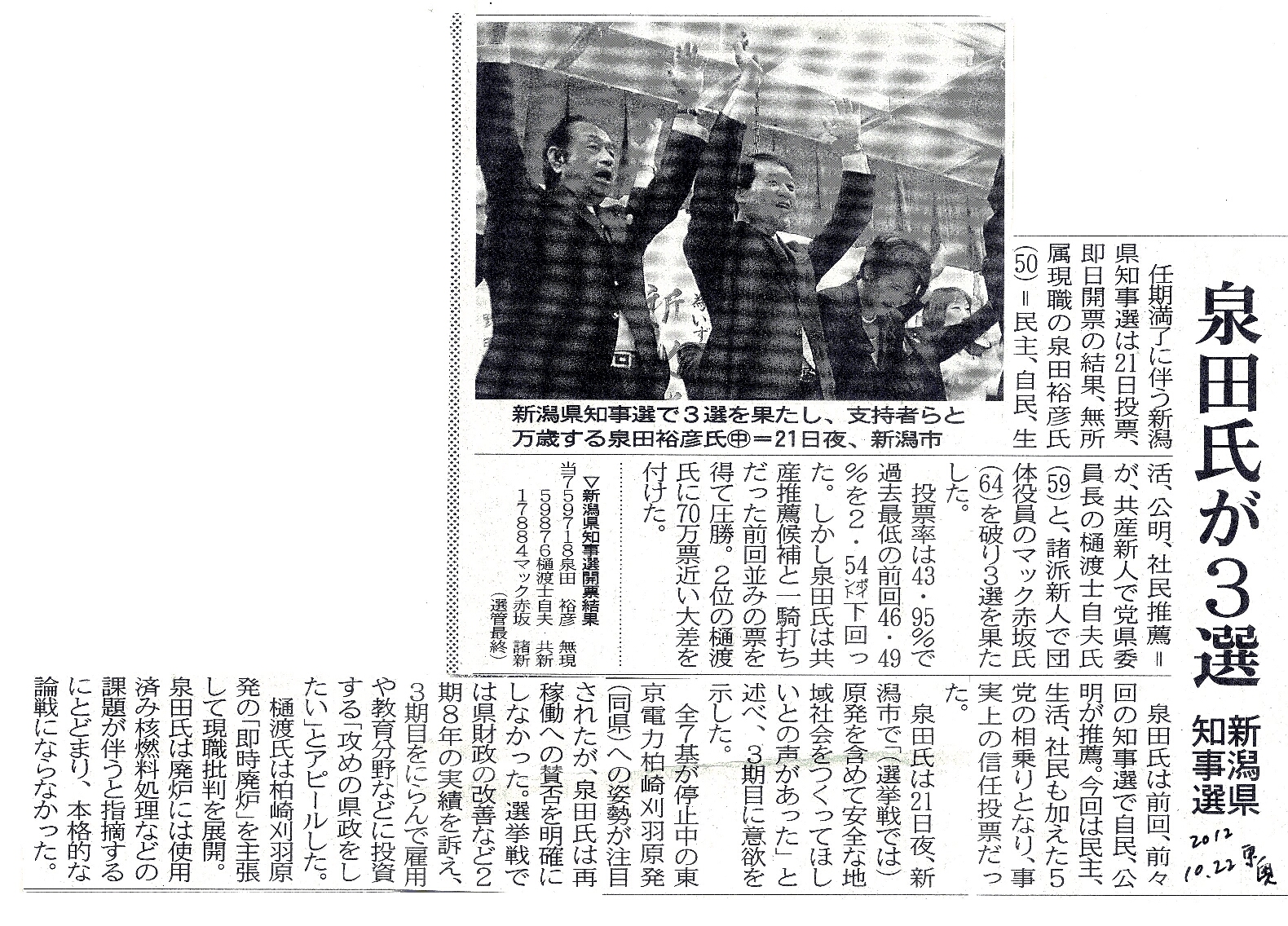 [2012_10_22_02]泉田氏が3選 新潟県知事選(東奥日報2012年10月22日)
