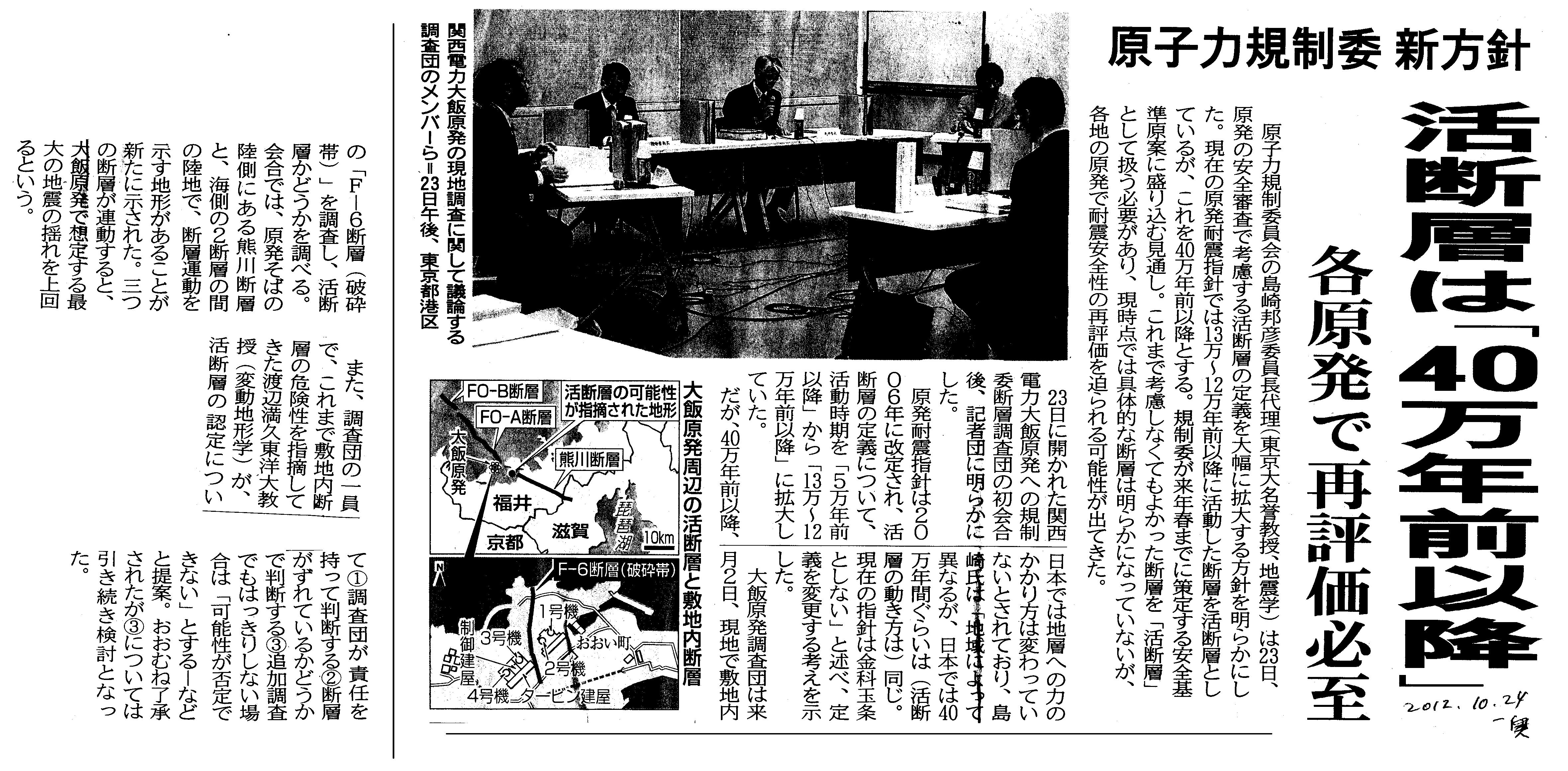 [2012_10_24_01]原子力規制委 新方針 活断層は「40万年前以降」(東奥日報2012年10月24日)