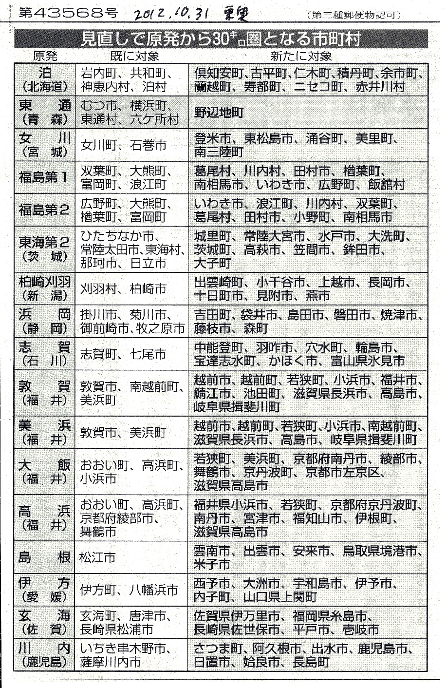 [2012_10_31_03]見直しで原発から30キロ圏となる市町村(東奥日報2012年10月31日)