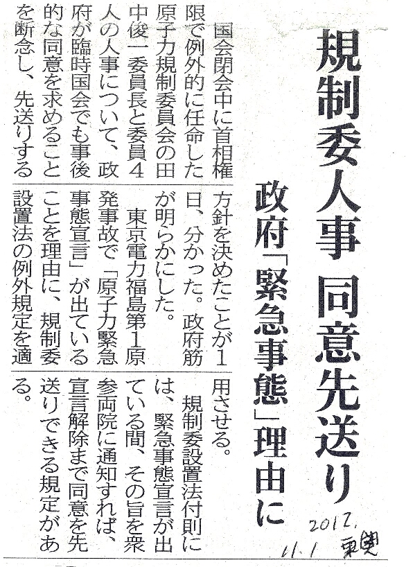 [2012_11_01_01]規制委人事 同意先送り 政府「緊急事態」理由に(東奥日報2012年11月1日)