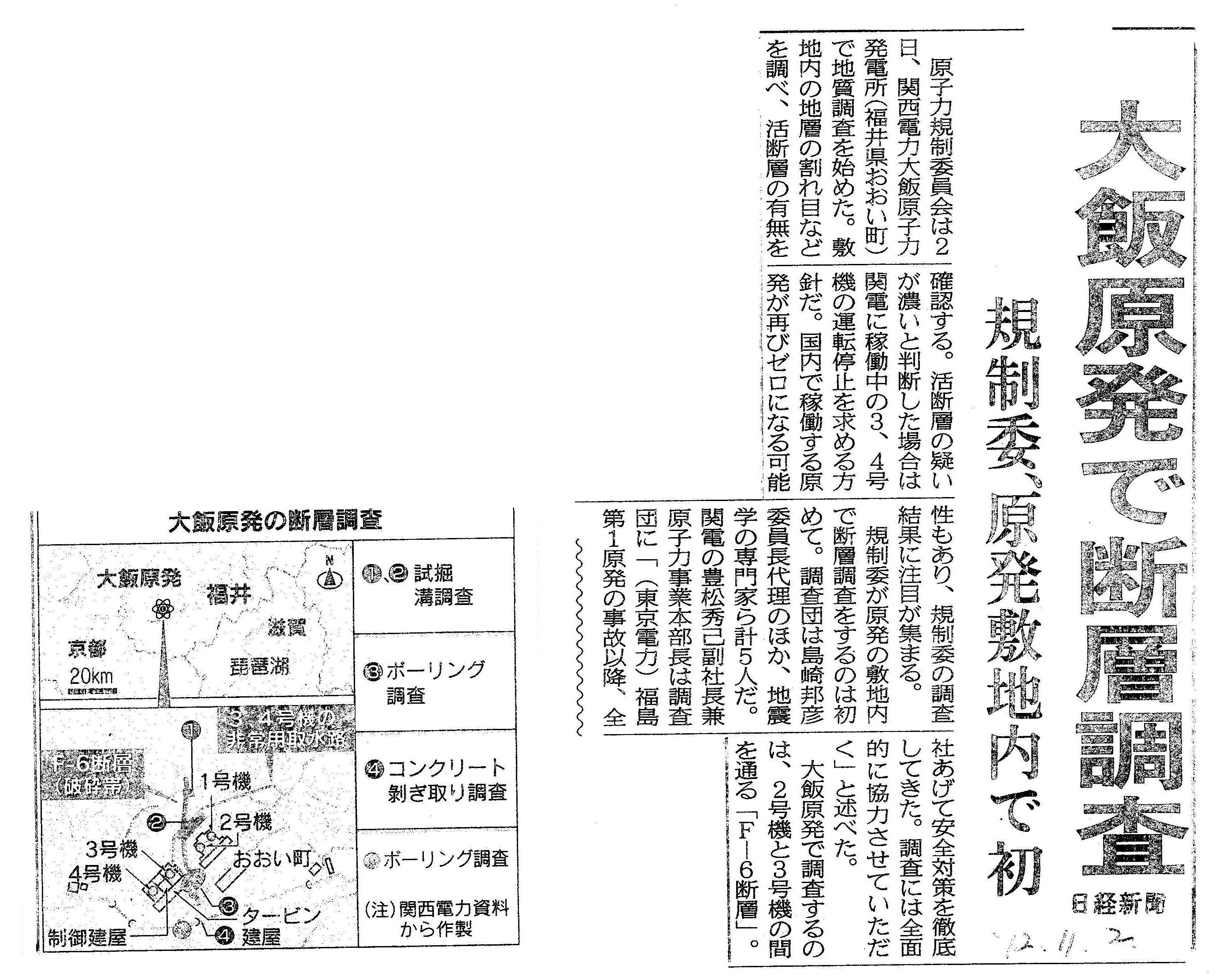 | [2012_11_02_01]大飯原発で断層調査 規制委、原発敷地内で初 (日経新聞2012年11月2日) |