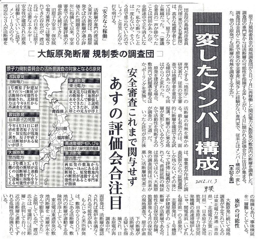 | [2012_11_03_02]大飯原発断層 規制委の調査団 一変したメンバー構成 安全審査 これまで関与せず あすの評価会合注目(東奥日報2012年11月3日) |