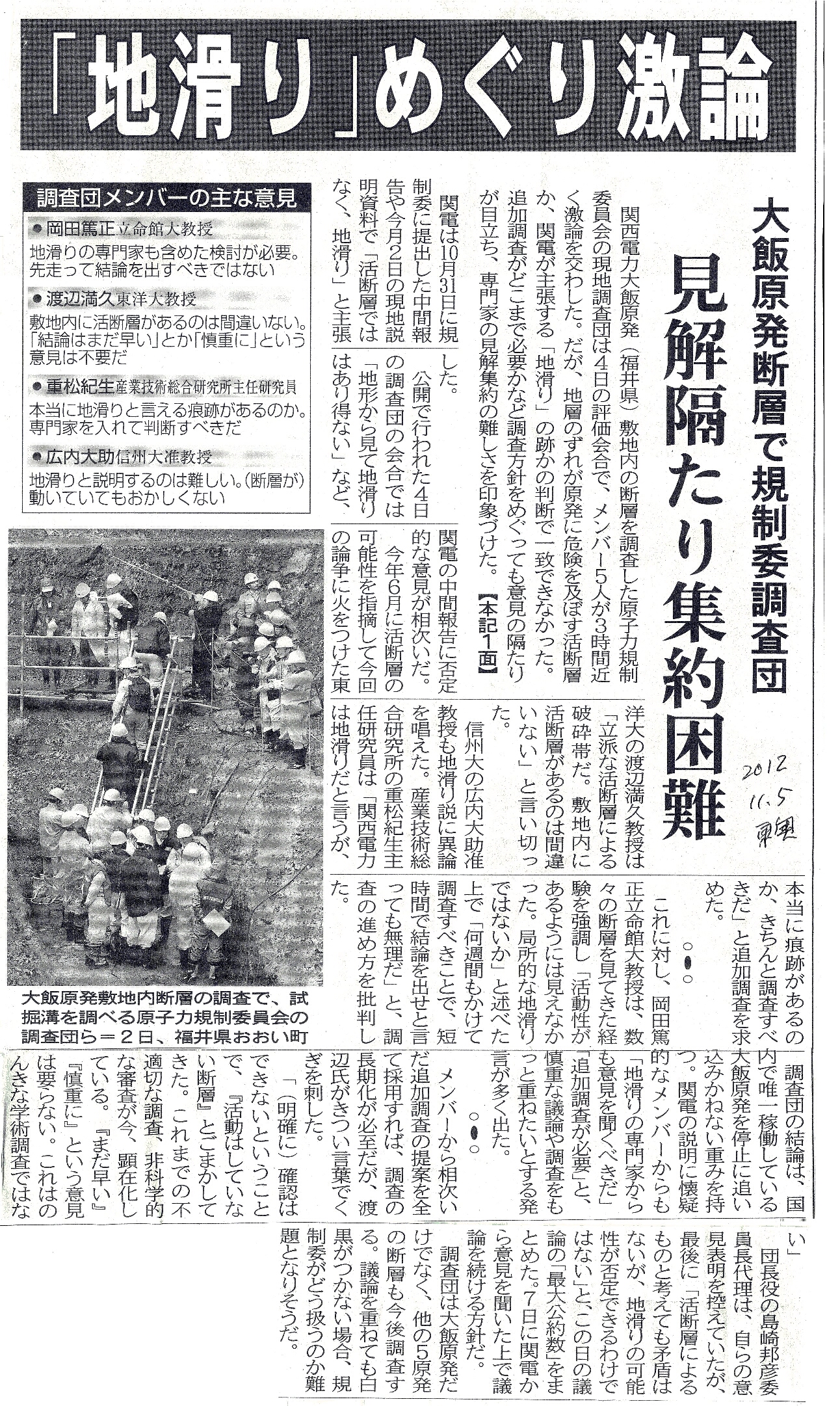 | [2012_11_05_01]「地滑り」めぐり激論 大飯原発断層で規制委調査団 見解隔たり 集約困難(東奥日報2012年11月5日) |
