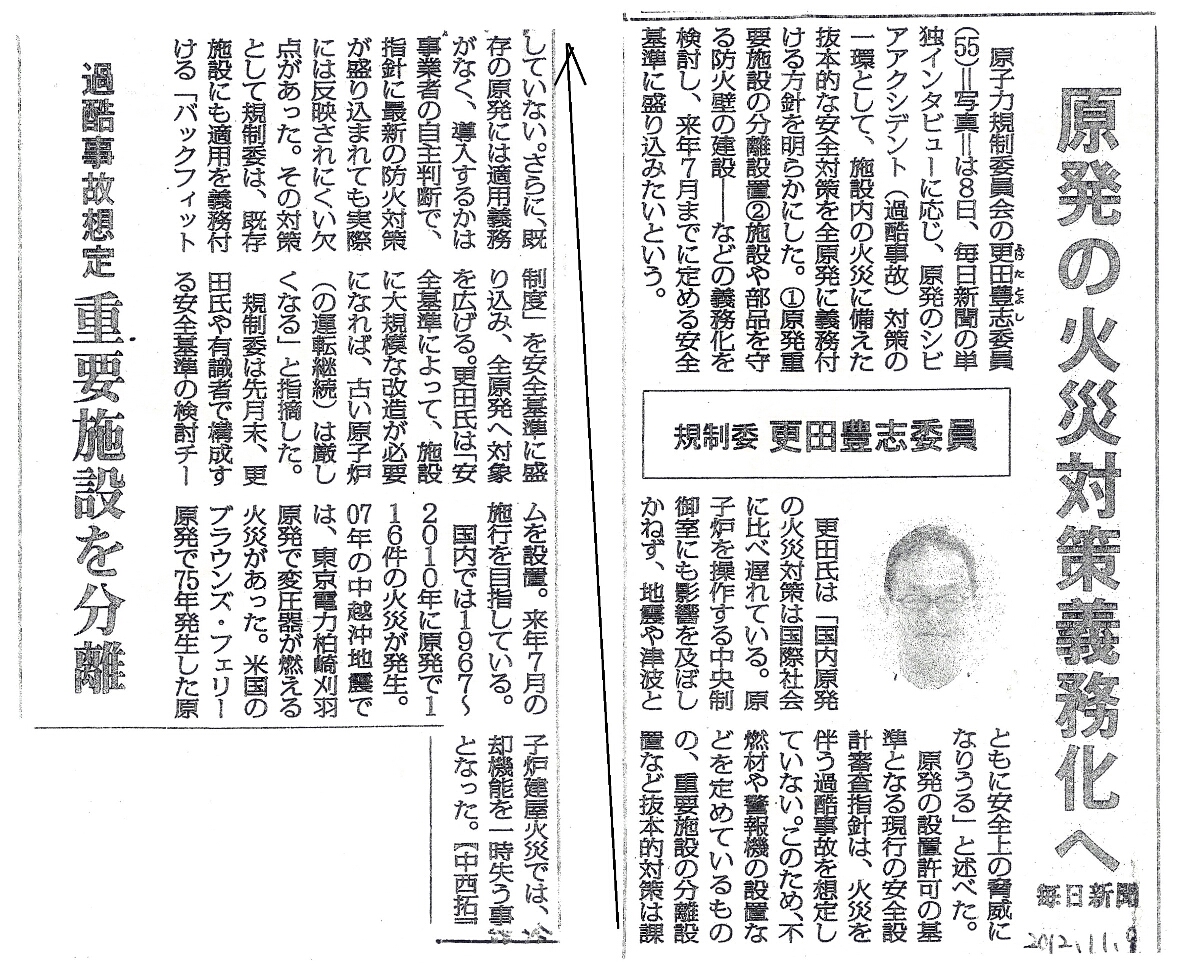 [2012_11_09_02]原発の火災対策義務化へ 規制委更田豊志委員 過酷事故想定 重要施設を分離(毎日新聞2012年11月9日)