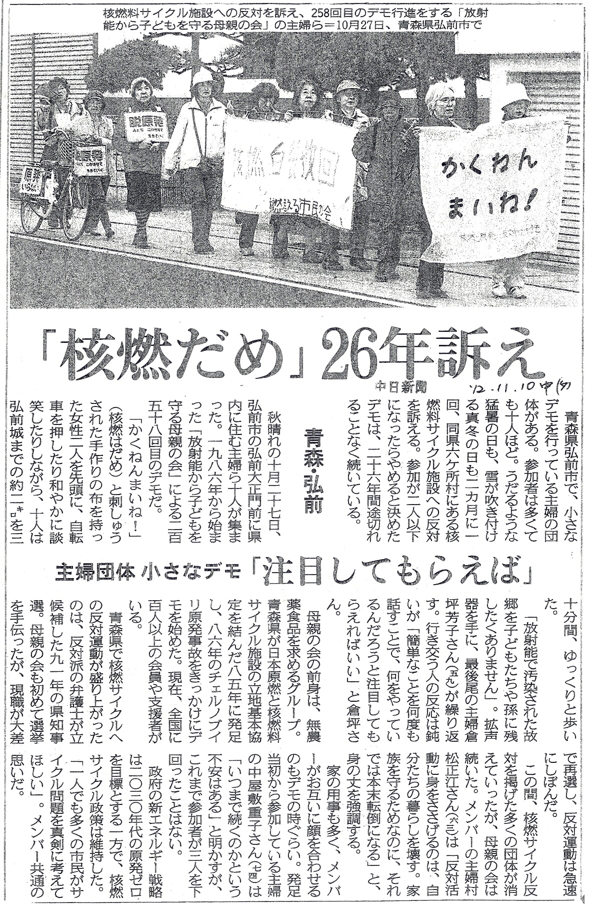 [2012_11_10_01]「核燃だめ」26年訴え 青森・弘前 主婦団体 小さなデモ「注目してもらえば」(中日新聞2012年11月10日)