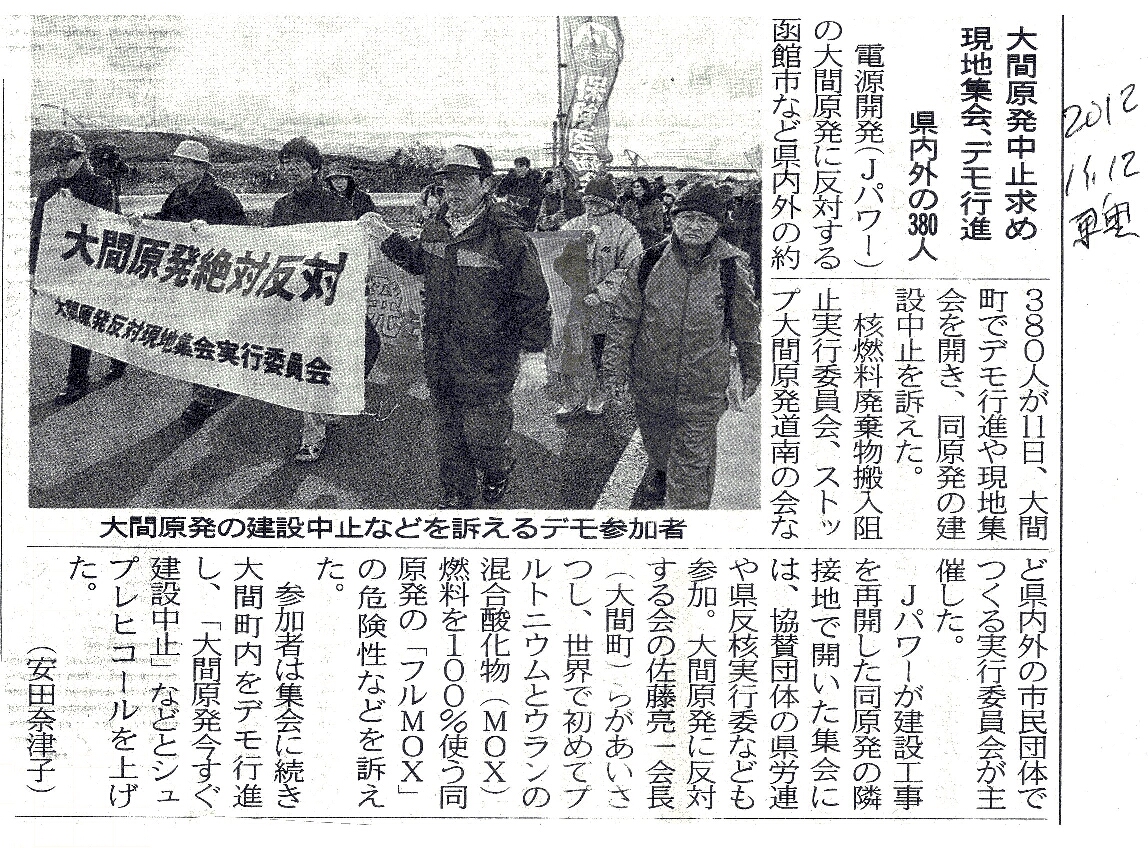 | [2012_11_12_01]大間原発中止求め 現地集会、デモ行進 県内外の380人(東奥日報2012年11月12日) |