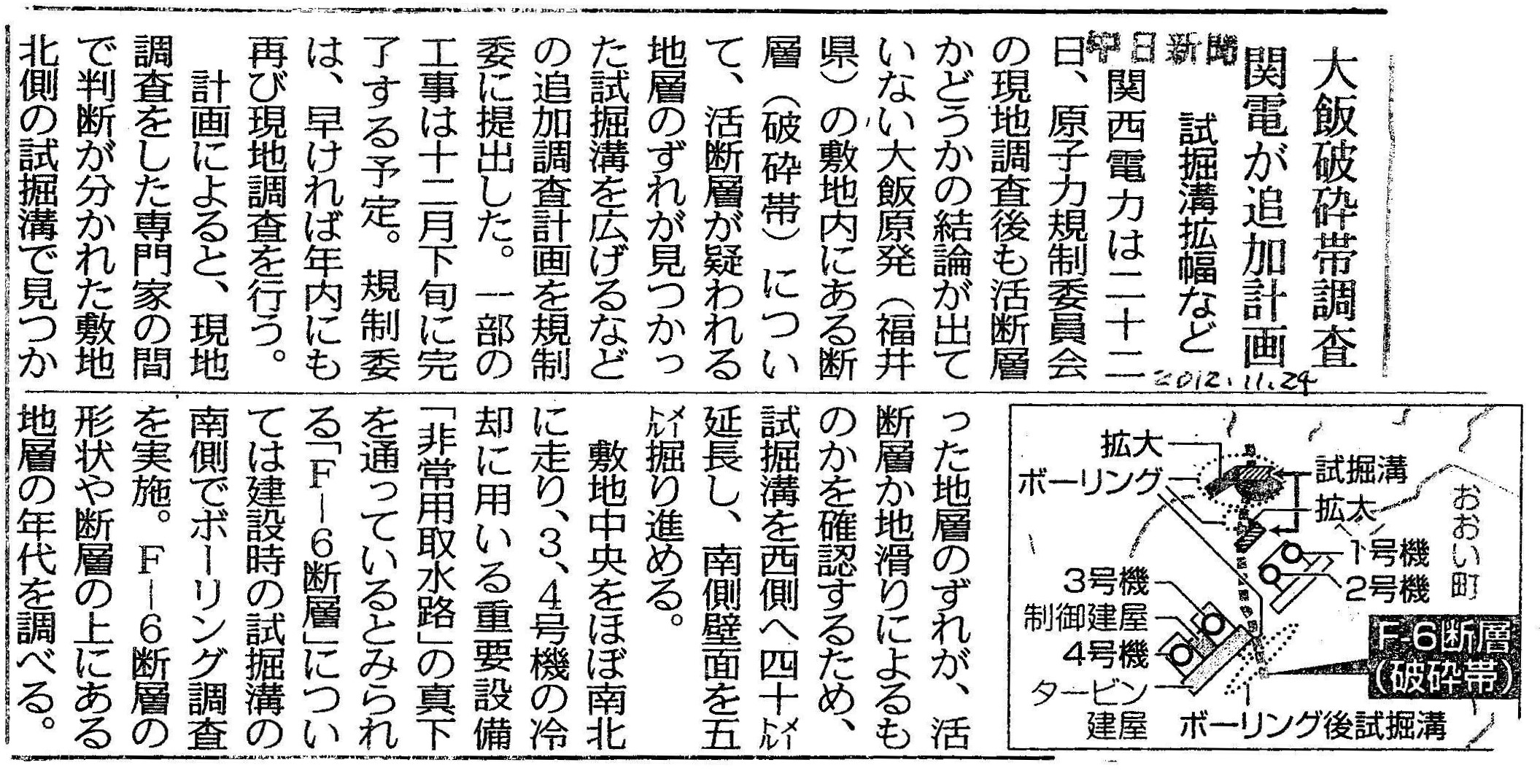 [2012_11_24_01]大飯破砕帯調査 関電が追加計画 試掘溝拡幅など(中日新聞2012年11月24日)