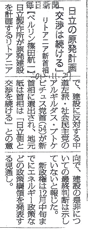 [2012_11_27_01]日立の原発計画 「交渉は続ける」 リトアニア新首相(毎日新聞2012年11月27日)