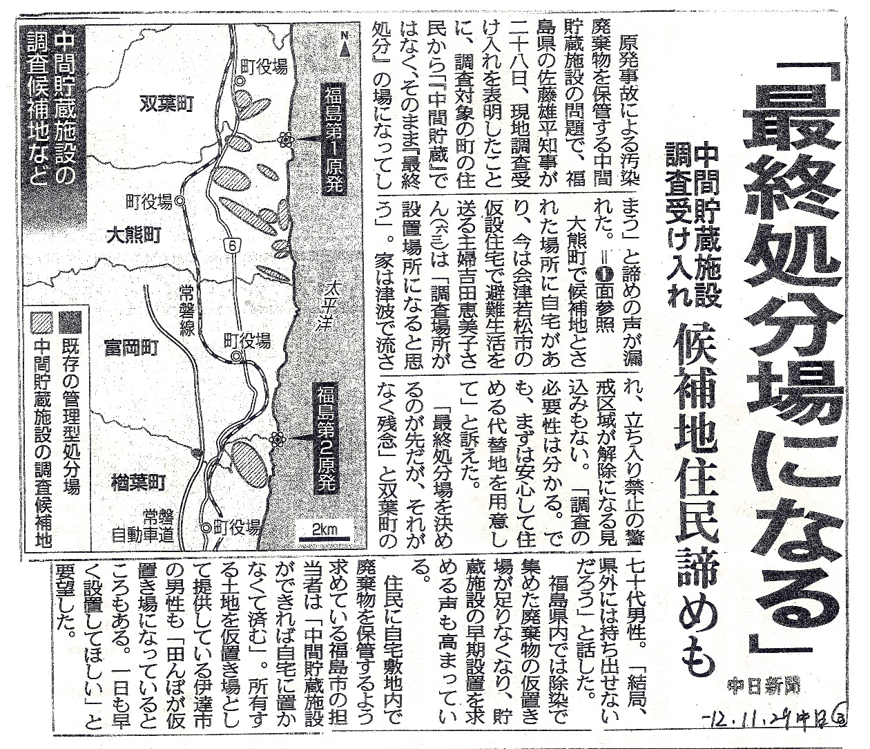[2012_11_29_01]「最終処分場になる」 中間貯蔵施設調査受け入れ 候補地住民諦めも(中日新聞2012年11月29日)