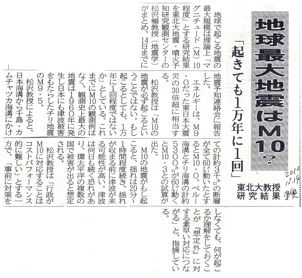 [2012_12_01_01]地球最大地震はM10 起きても1万年に1回(東奥日報2012年12月1日)