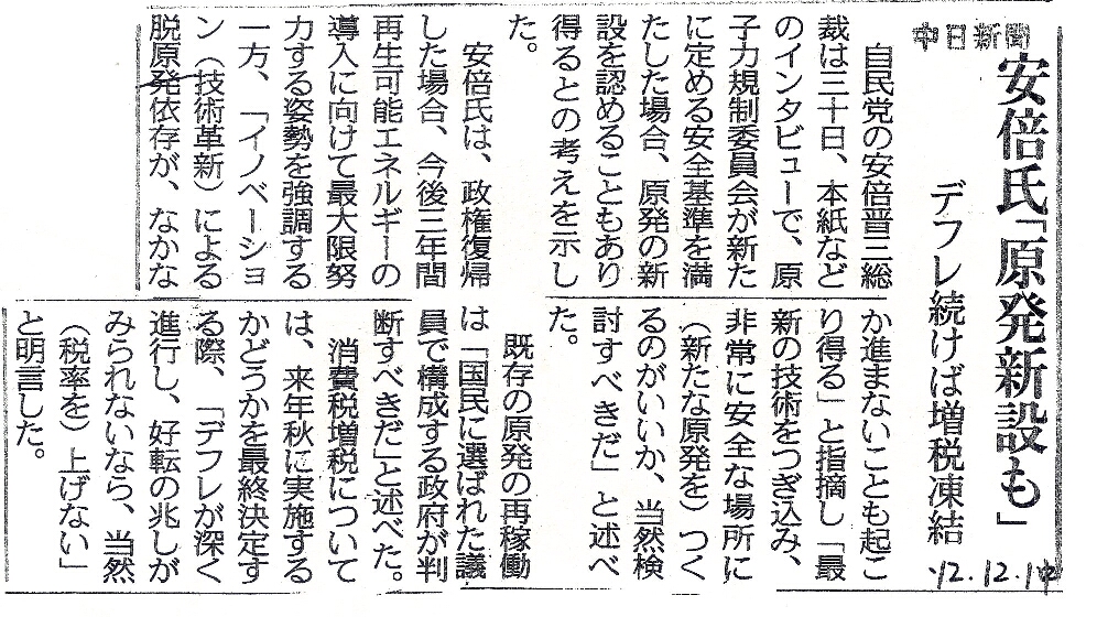 [2012_12_01_03]安倍氏「原発新設も」 デフレ続けば増税凍結(中日新聞2012年12月1日)