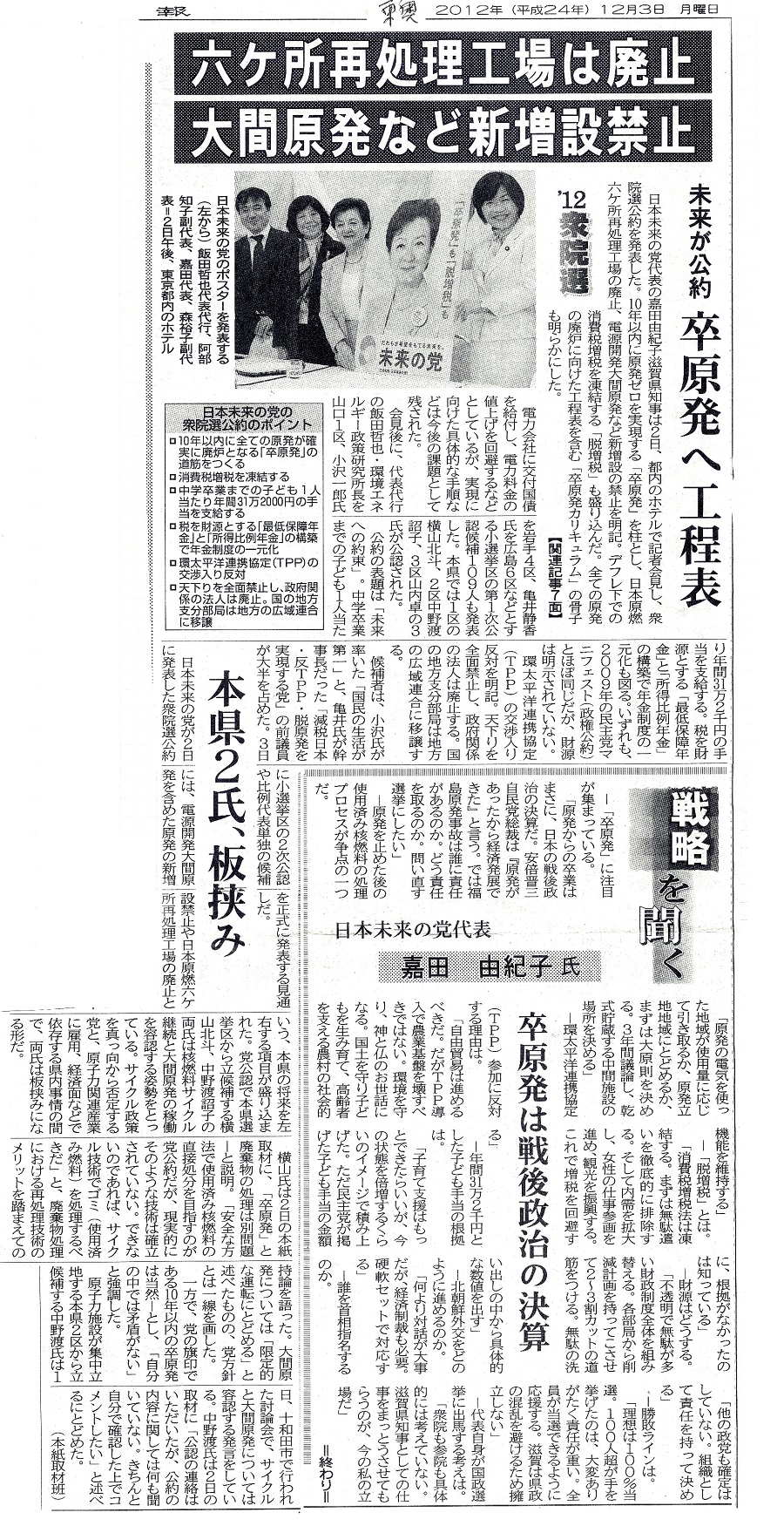 日本未来の党代表の嘉田由紀子滋賀県知事は2日、都内のホテルで記者会見し、衆院選公約を発表した。10年以内に原発ゼロを実現する「卒原発」を柱とし、日本原燃六ヶ所再処理工場の廃止、電源開発大間原発など新増設の禁止を明記。デフレ下での消費税増税を凍結する「脱増税」も盛り込んだ。全ての原発の廃炉に向けた工程表を含む「卒原発カリキュラム」の骨子も明らかにした。
