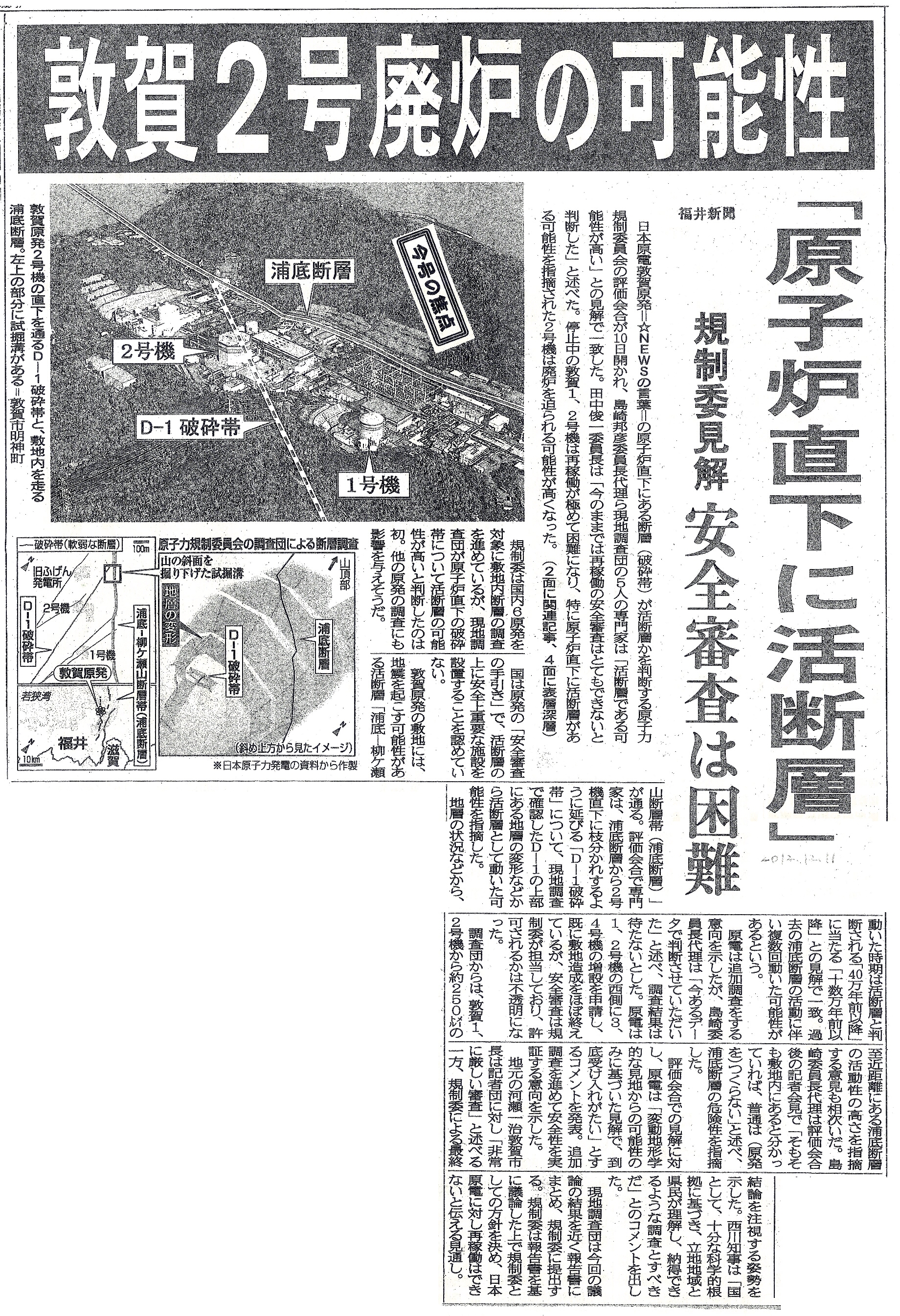 | [2012_12_11_05]敦賀2号廃炉の可能性 「原子炉直下に活断層」 規制委見解 安全審査は困難(福井新聞2012年12月11日) |
