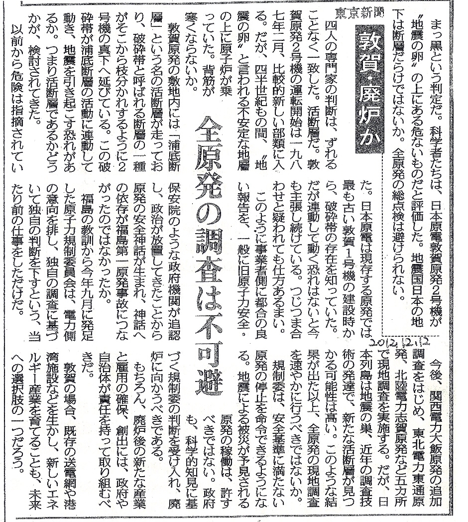 | [2012_12_12_01]敦賀・廃炉か 全原発の調査は不可避(東京新聞2012年12月12日) |