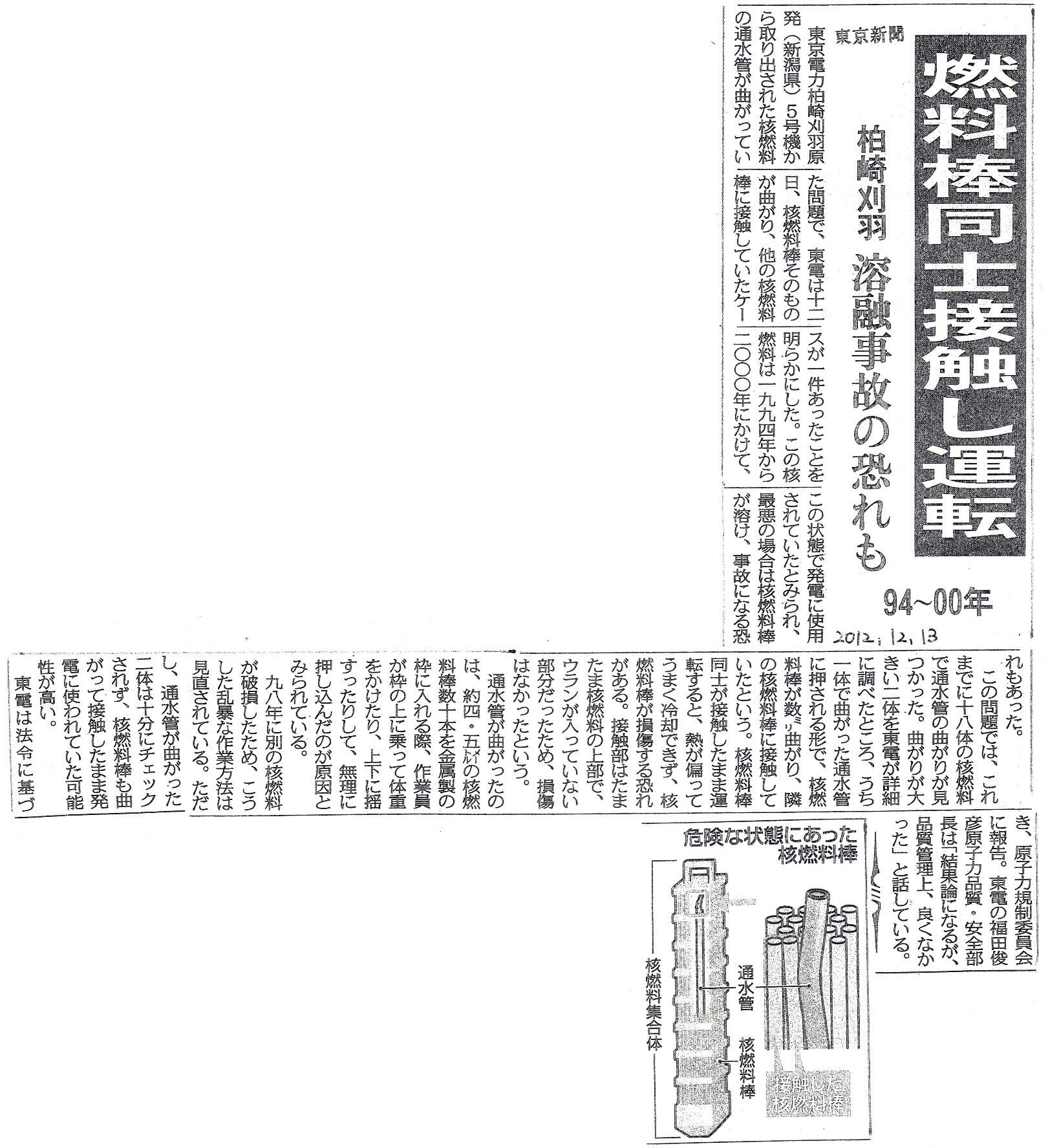 | [2012_12_13_02]燃料棒同士接触し運転 柏崎刈羽 溶融事故の恐れも 94〜00年(東京新聞2012年12月13日) |