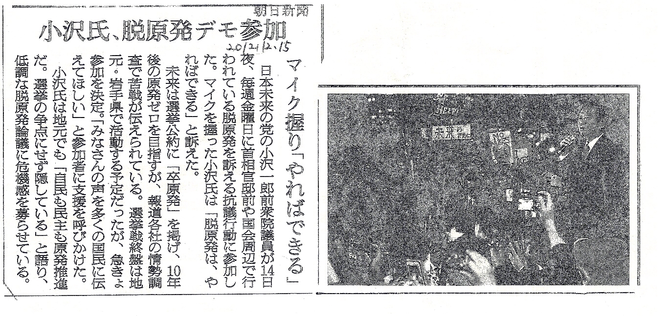 [2012_12_15_01]小沢氏、脱原発デモ参加 マイク握り「やればできる」(朝日新聞2012年12月15日)